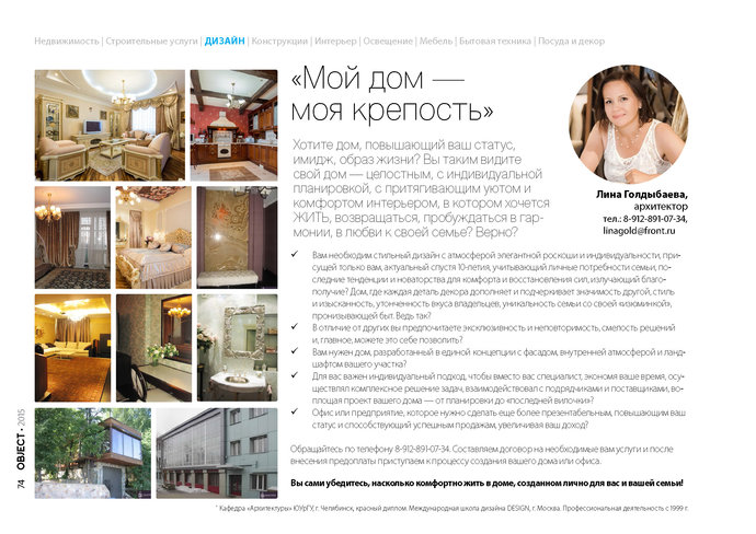 Дом, в котором царит счастье, благополучие, удовольствие излучает теплом всю семью, направляет на уверенную яркую жизнь, решение всех дел и вечером встречает, чтоб объединить вновь всю семью в уютном комфортном интерьере, соответствующем образу Вашей жизни, имиджу и статусу.