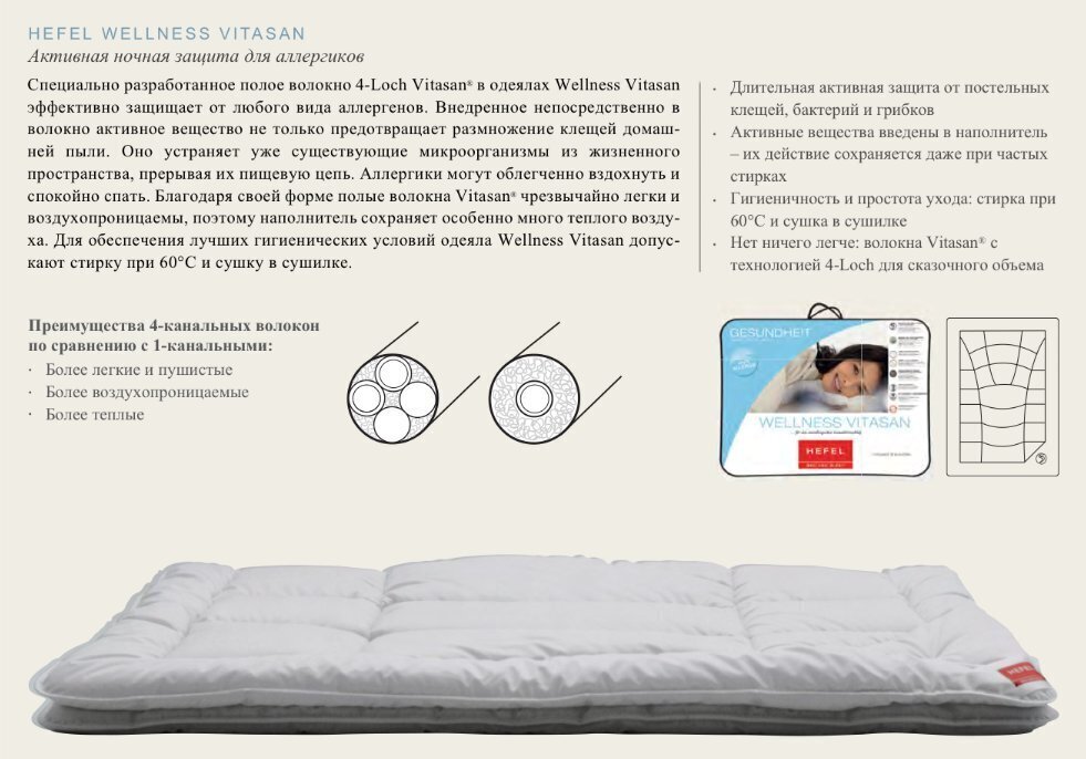 Непосредственно включенный в волокна активный ингредиент создает постоянную защиту от пылевых клещей, бактерий и грибков. Научные исследования подтвердили это. Из-за их 4-полостной формы полые волокна Vitasan ® являются исключительно легкими и дышащими - и наполнитель может сэкономить гораздо больше теплого воздуха.