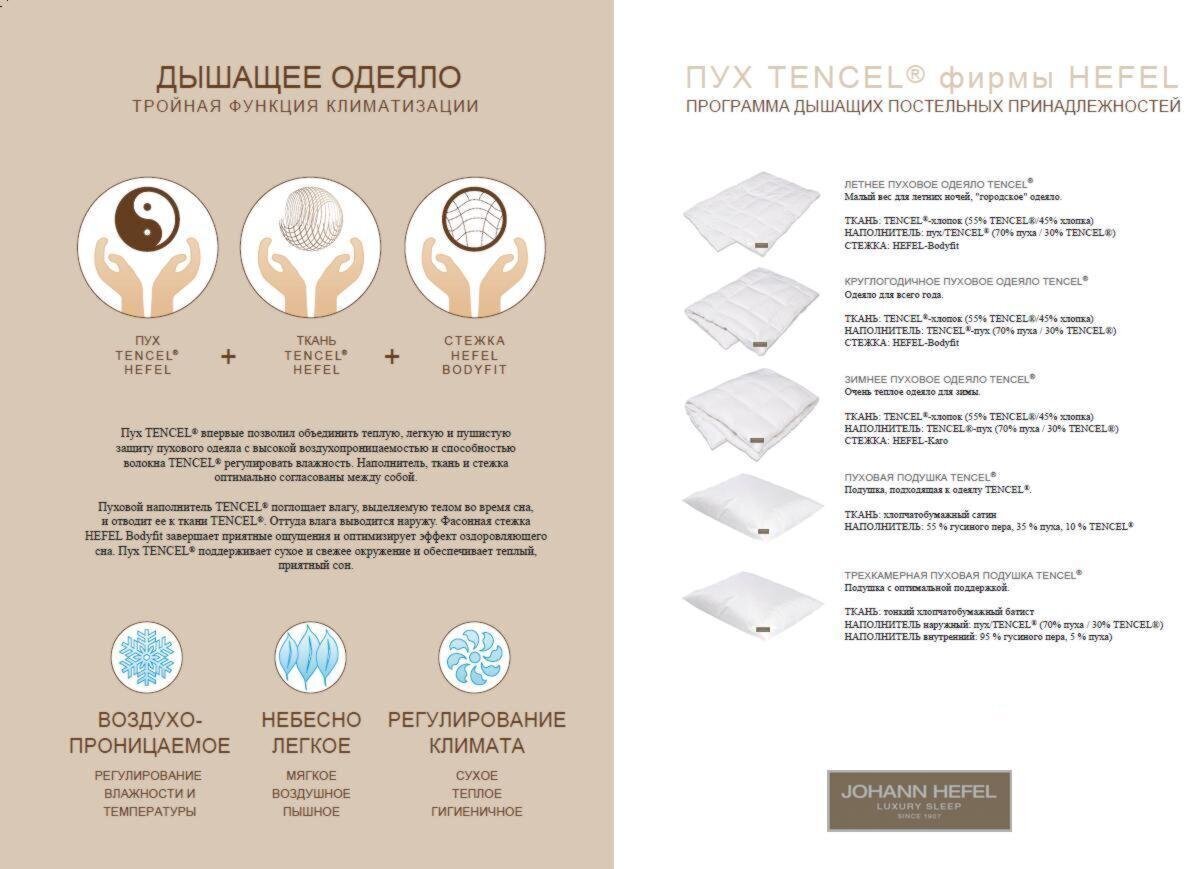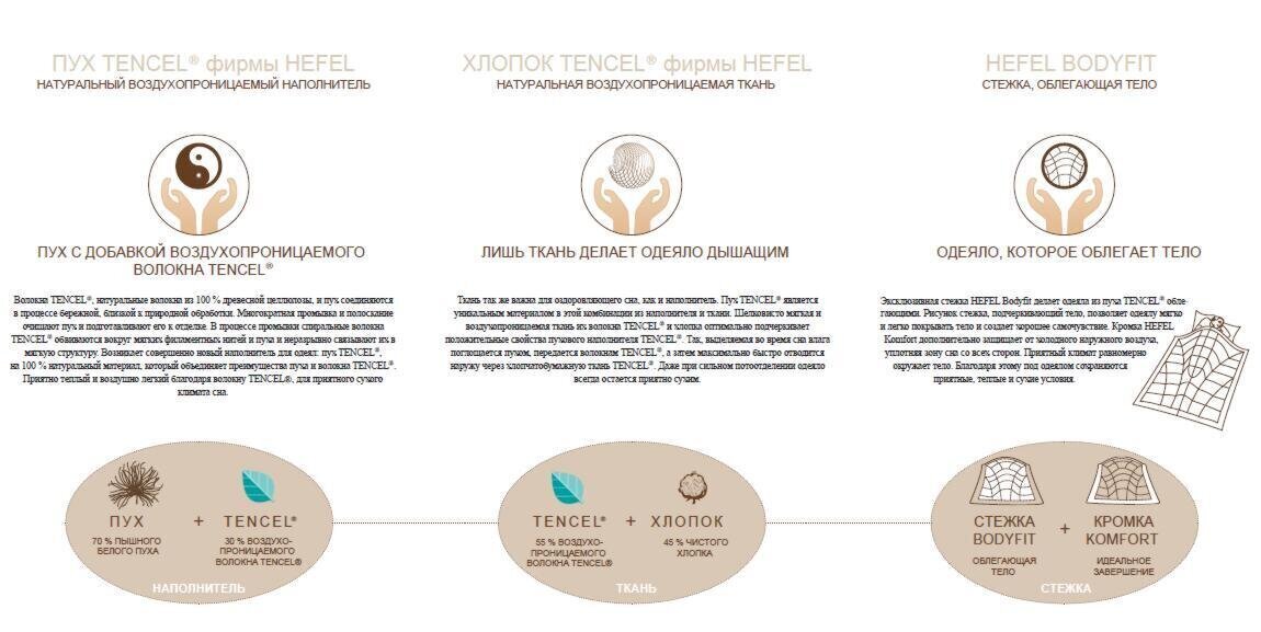 эффект уюта, создаваемого одеялом. Пух TENCEL® поддерживает сухость и свежесть в постели и обеспечивает теплый и приятный сон.