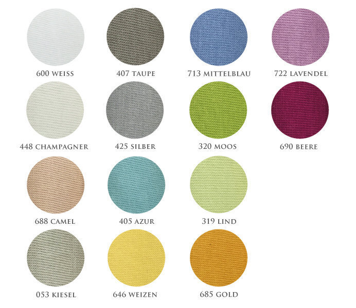 Цветовая палитра: 600/белый/weiss, 448/шампанского цвет /champagne, 688/коричневый/camel, 407/бежевый/taupe, 425/серебро/ silver, 053/ галька/ pebble, 646/пшеница/wheat, 685/золото/gold, 319/липа/lime green/светло-зеленый, 320/мох/mooss, 713/синий/medium blue, 405/ лазурный /azur, 722/ лавандовый/ lavender, 690/ягодный / beery, 424/антрацит/ ANTHRACITE, 729/ ТЕМНО-СИНИЙ/ NAVY