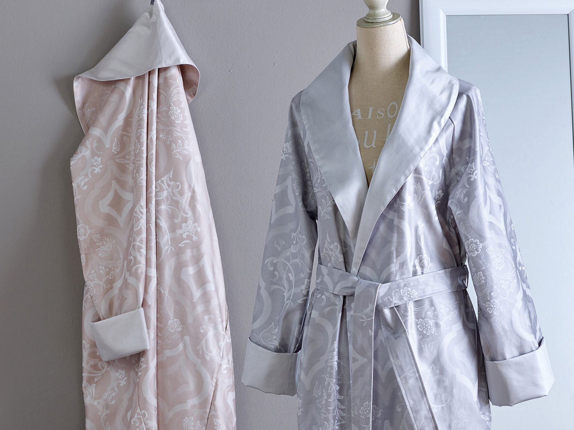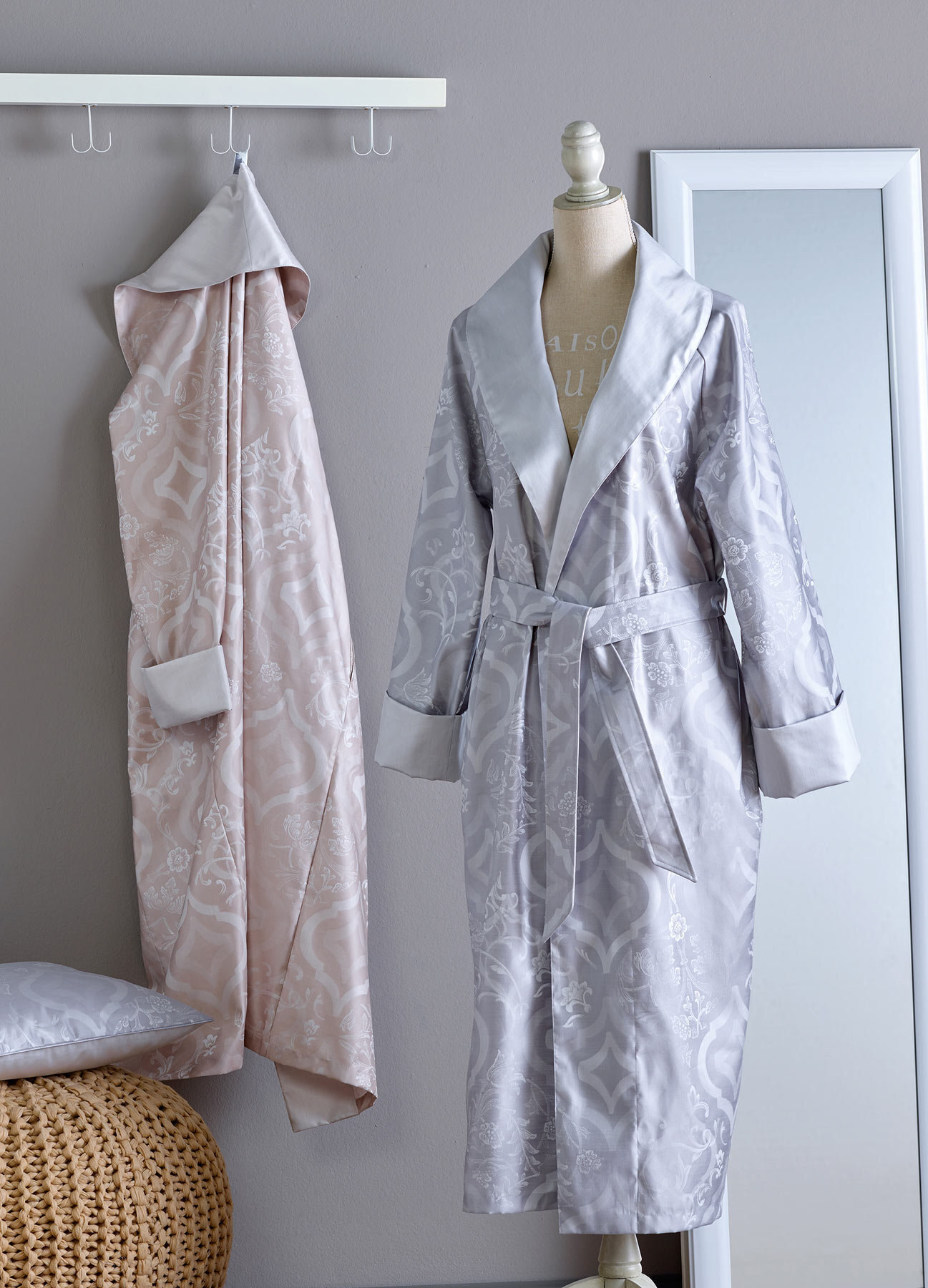 Элегантный дизайн этого халата дополняется воротником-шалькой и манжетой. Длинный крой подчеркивает элегантный характер.