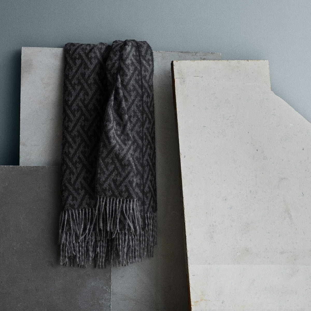 Дизайн вдохновлен традиционными японскими узорами с тонкой ссылкой на природу посредством упрощенного геометрического рисунка. Бахрома на конце пледа придает завершенность и элегантность современному датскому дизайну.