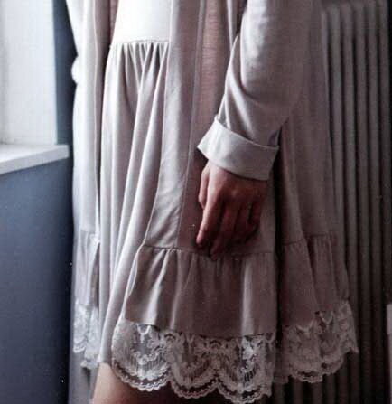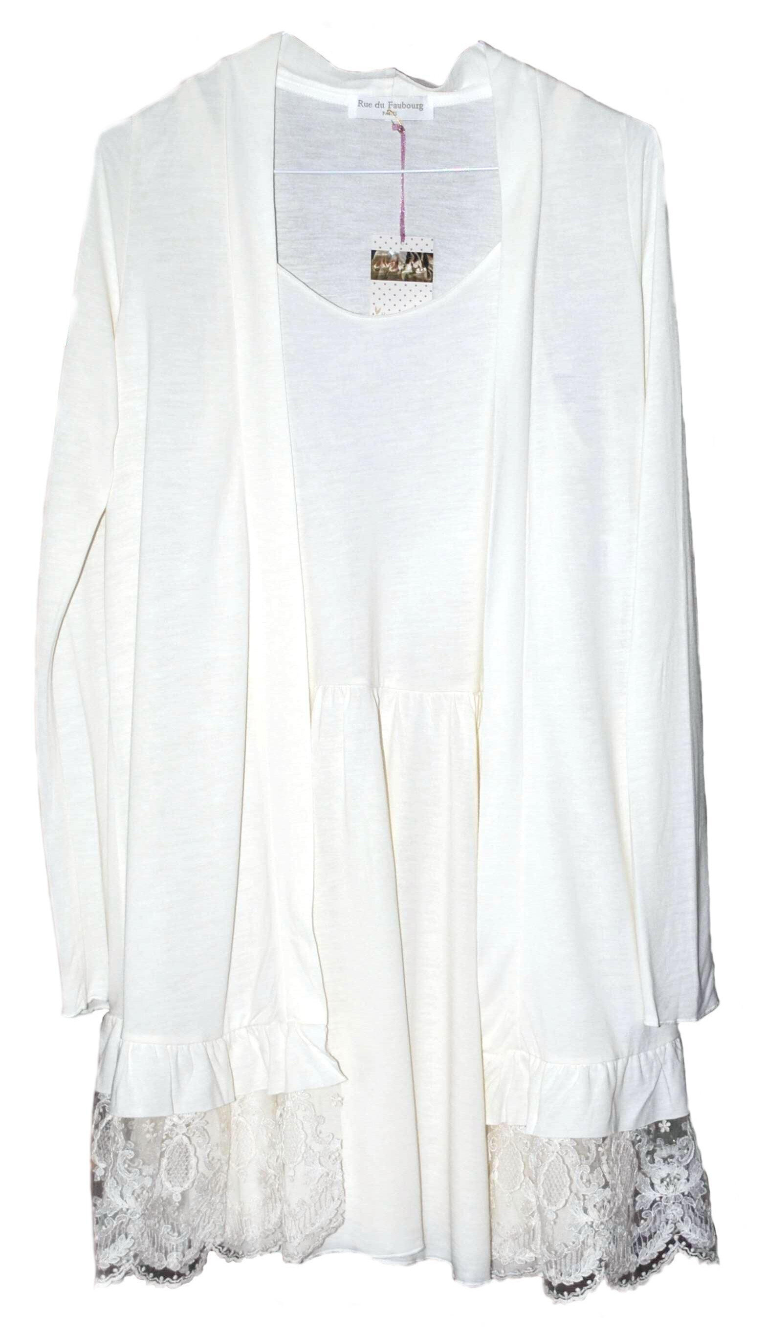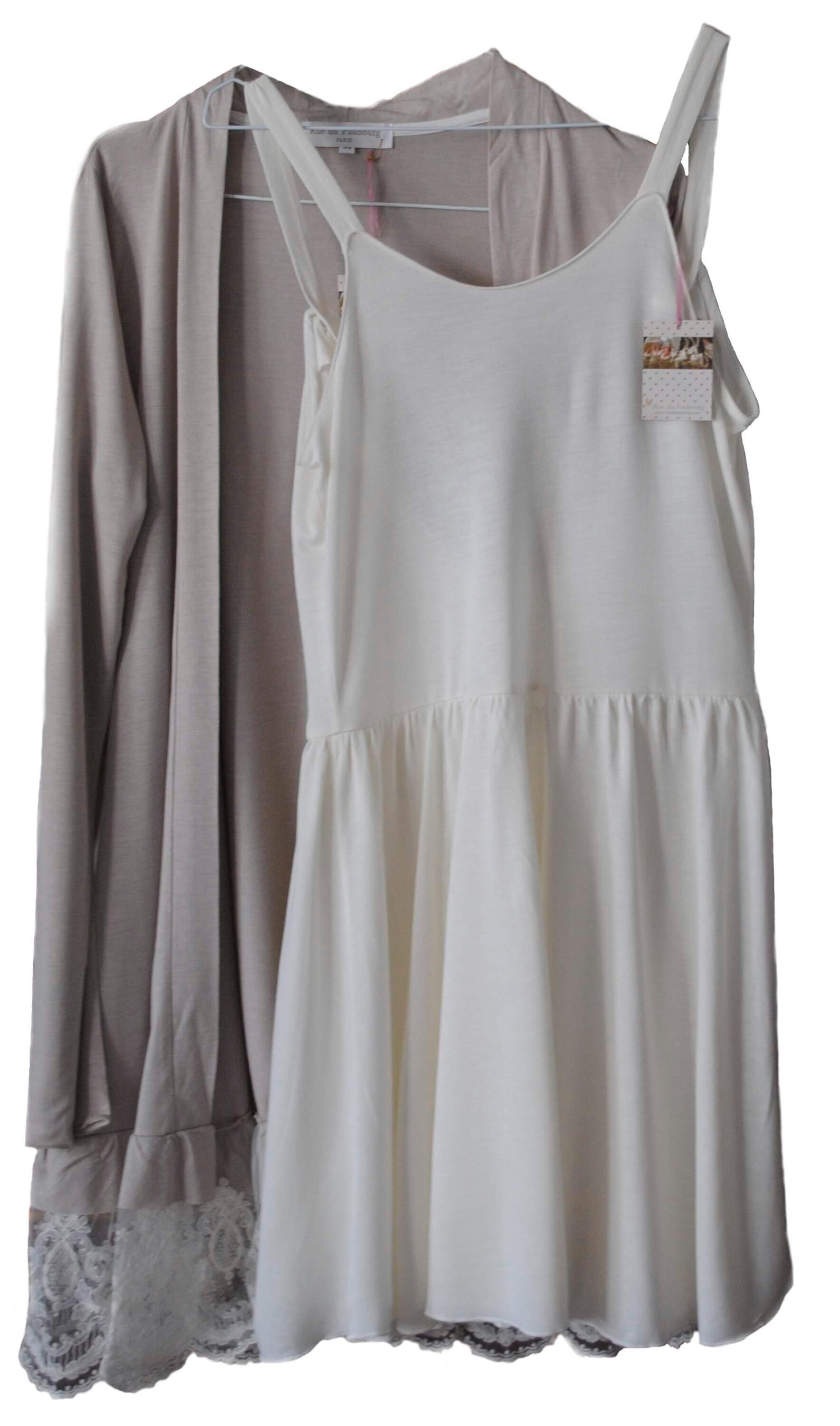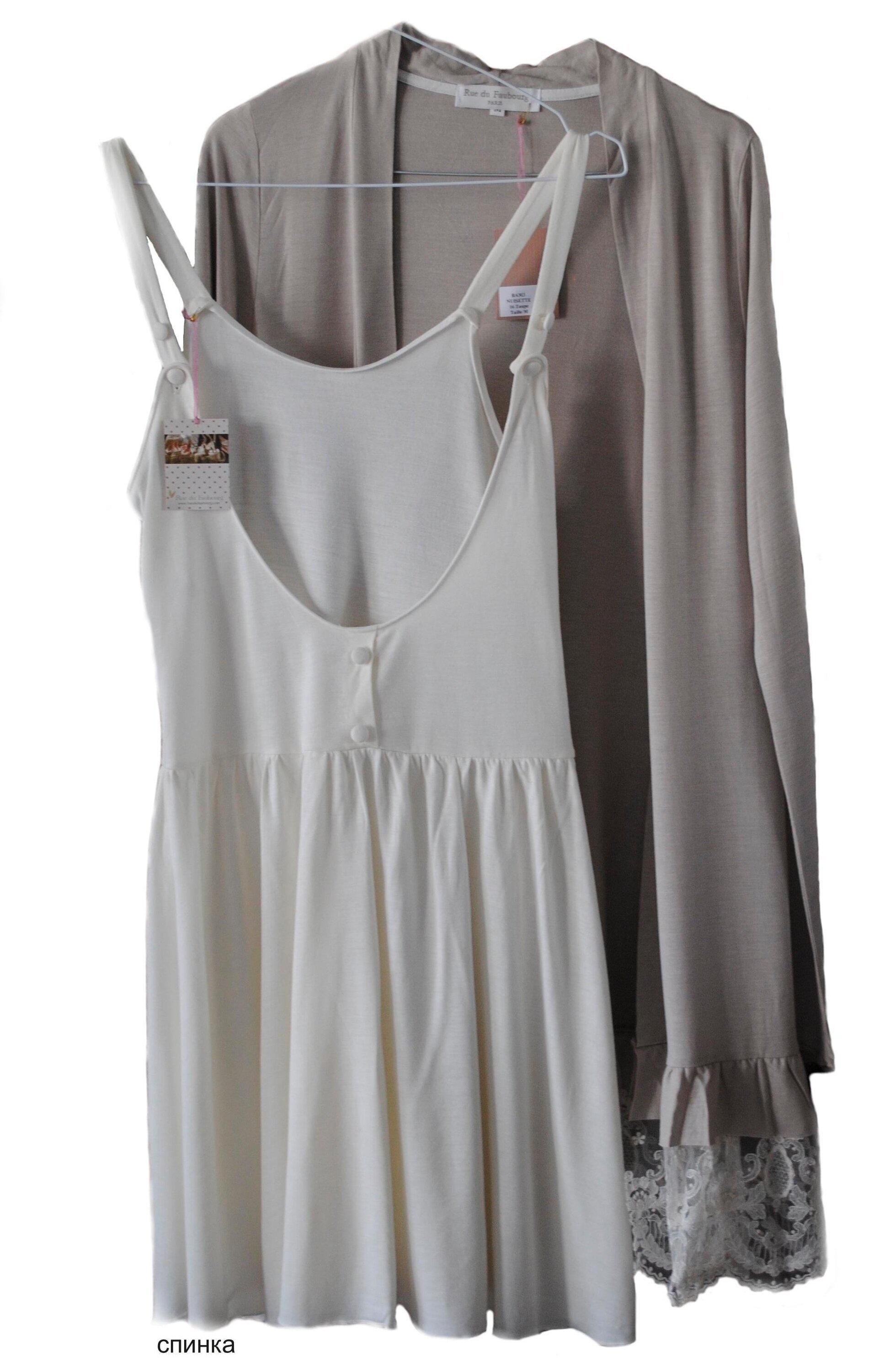 Пеньюар- халат накидной с нежным кружевом по низу и сорочка в виде платья с глубоким вырезом на спине.