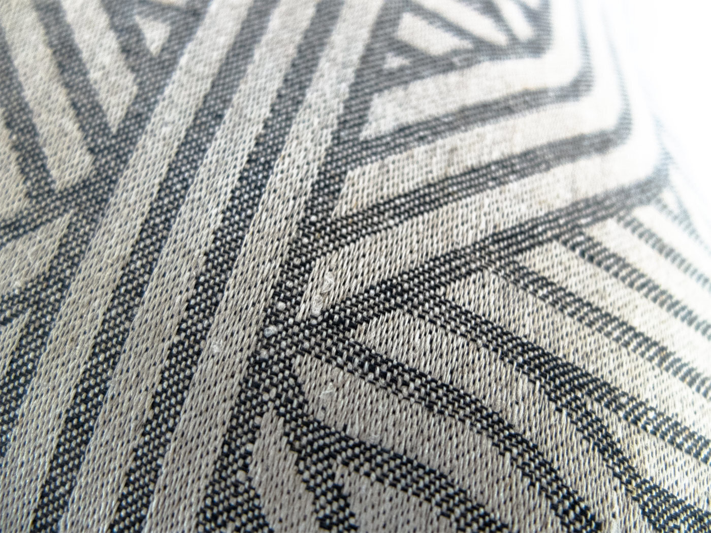 Жаккардовый рисунок, который состоит из переплетающихся линий, горизонтальных, вертикальных или под углом 45 °, точно так же, как если бы полотно ткалось само по себе. Дизайнер описывает свое творение как «шаблон, который на первый взгляд представляет собой случайную путаницу со структурой и системой».