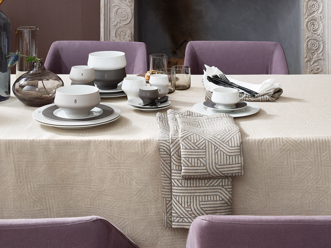 Легкий жаккардовый рисунок на слегка пестром фоне придает вашему столу празднично элегантный штрих.