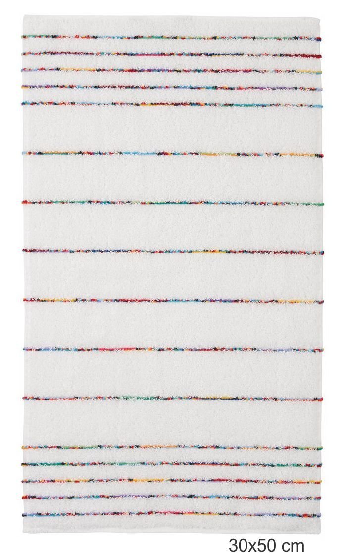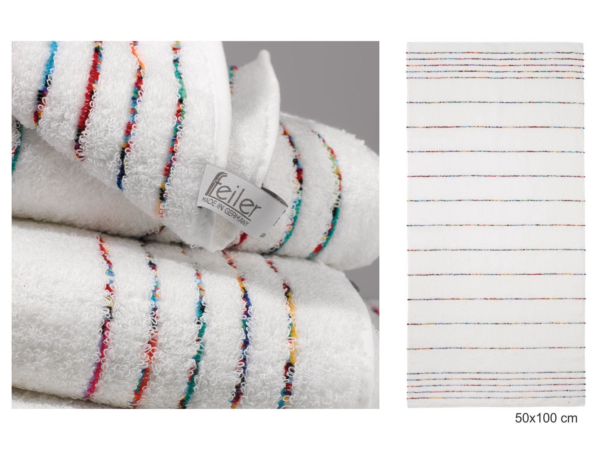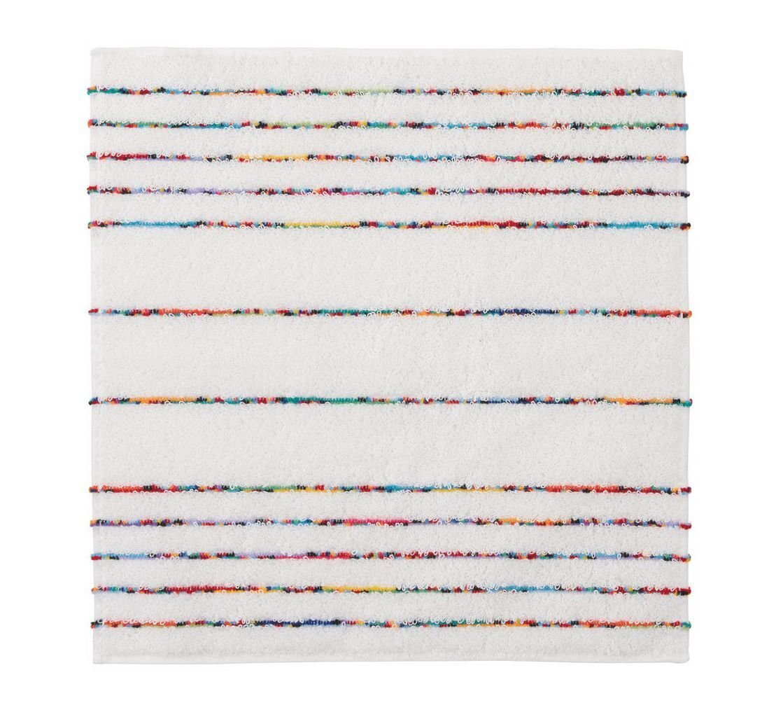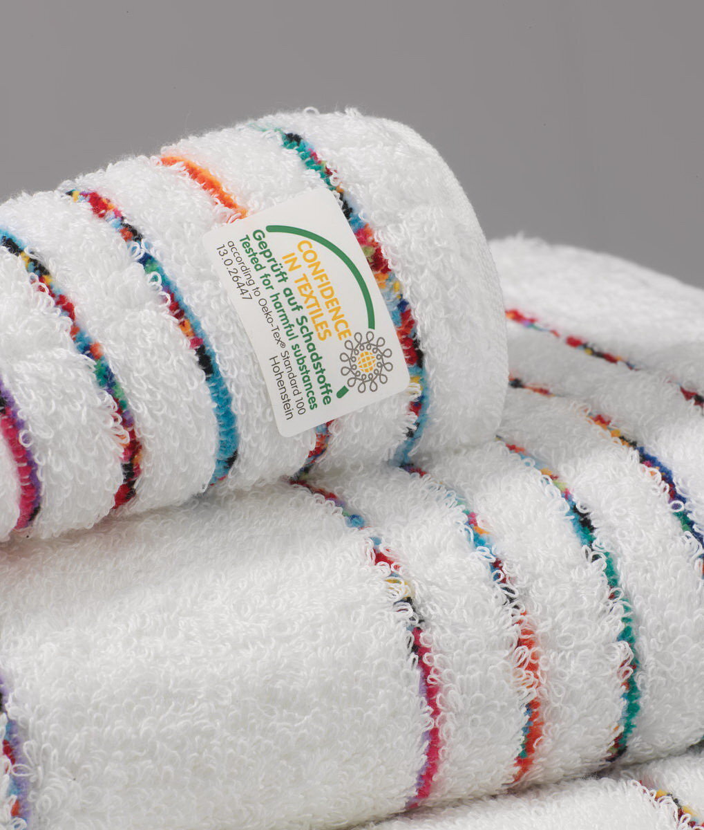 - Махровое белое полотенце с декоративными полосками из разноцветной нити шенилл