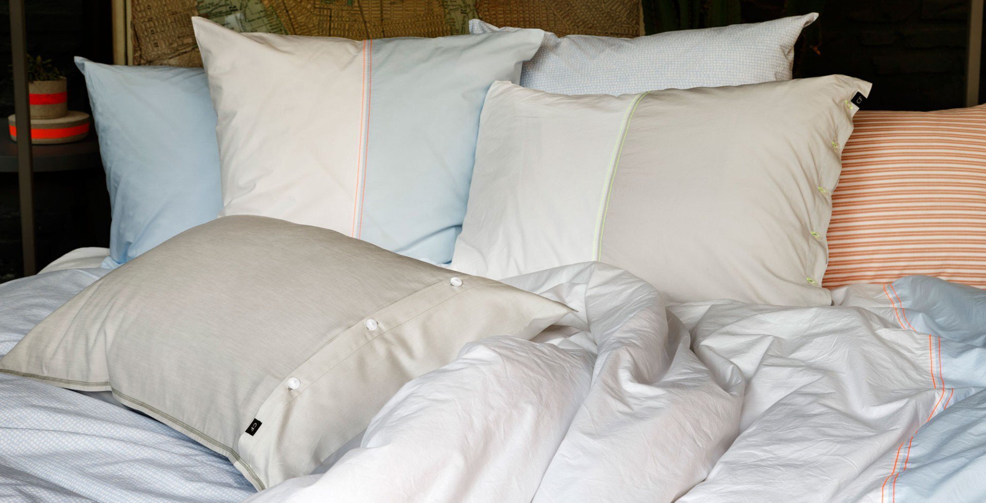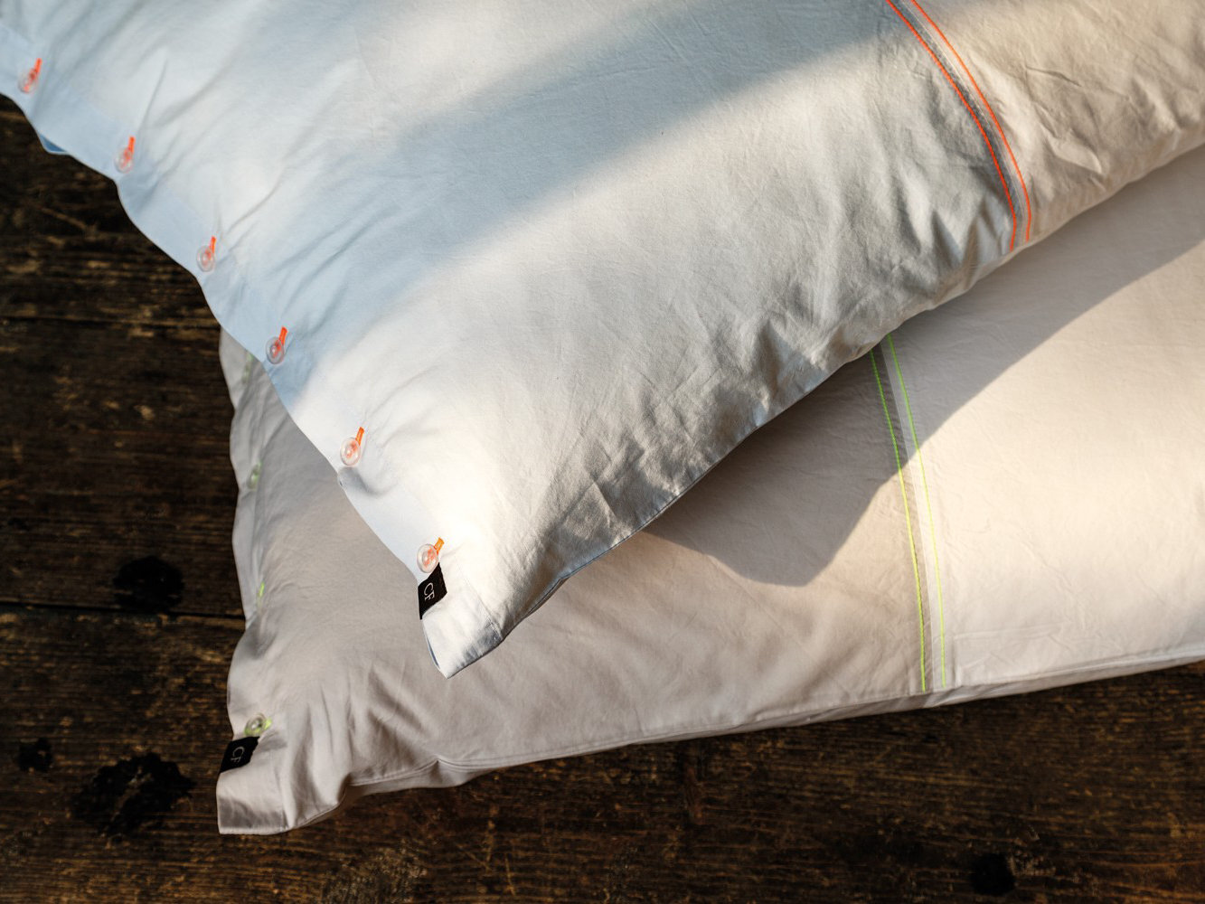 Наше постельное белье DAYBREAK, с его сложными графическими деталями дизайна, приглашает вас совершить короткий перерыв даже в середине дня. Удобный хлопок Casual Percale сочетает в себе два цвета, сшитые вместе по центру подушки и пододеяльника. Прохладные цветовые сочетания из оттенков синей лагуны и серебристой луны объединяются с контрастной, поразительной декоративной окантовкой из неонового оранжевого или неонового желтого. Тщательные детали от швов до петли включают квалифицированное мастерство и бодрящую новую современность художественного выражения.Швы являются яркими графическими акцентами. Специальная обработка поверхности были использованы для придания этому постельному белье более естественного и случайного внешнего вида. Это постельное белье простое, не требующее глажения.