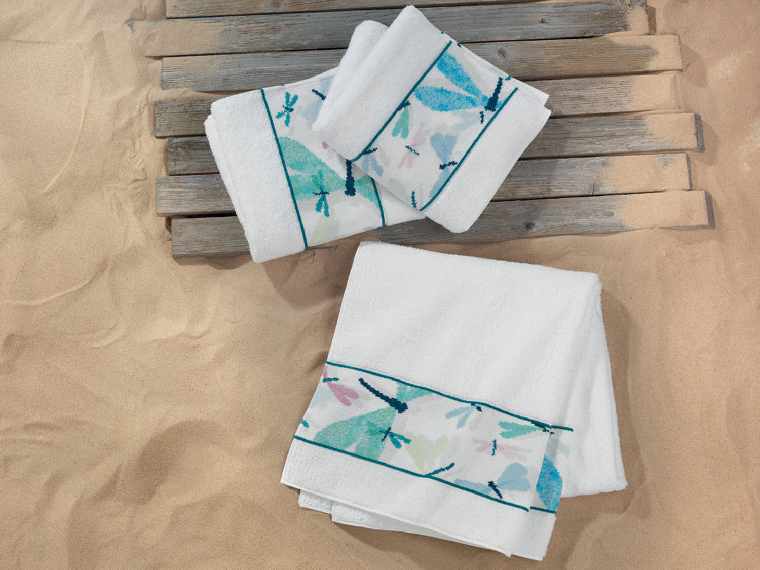 В махровом исполнении полотенца DRAGONFLY BORDER в ассортименте коллекции является дополнением двух дизайнов из шенилла: DRAGONFLY и DRAGONFLY BLUE. Полотенцем для лица может служить полотенце - салфетка из шенилл DRAGONFLY BLUE.