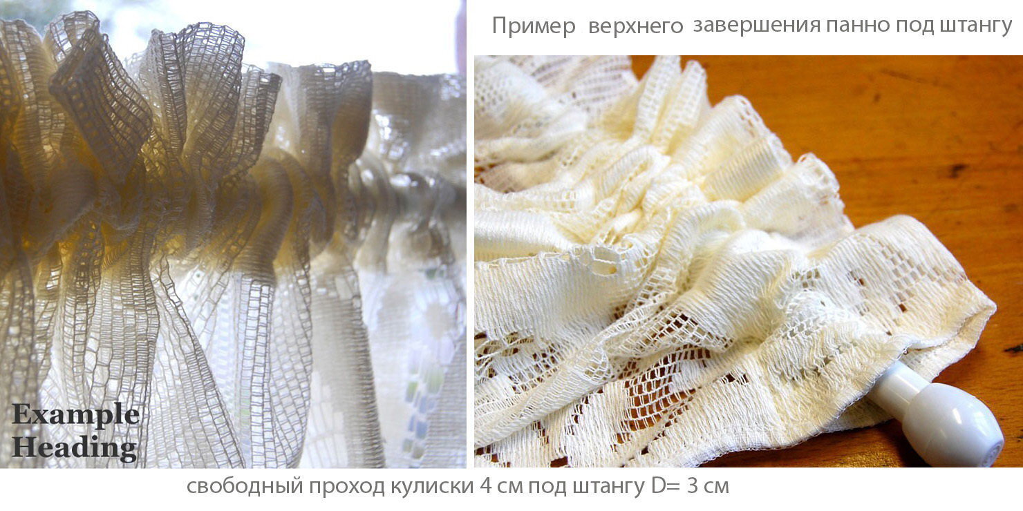 • Все панно имеют фигурные края (края с купонами) по бокам и внизу, а также карман-тоннель (кулиску) в верхней части для того, чтобы их можно было легко повесить (гофрированный верх с кулиской для штанги или лески).