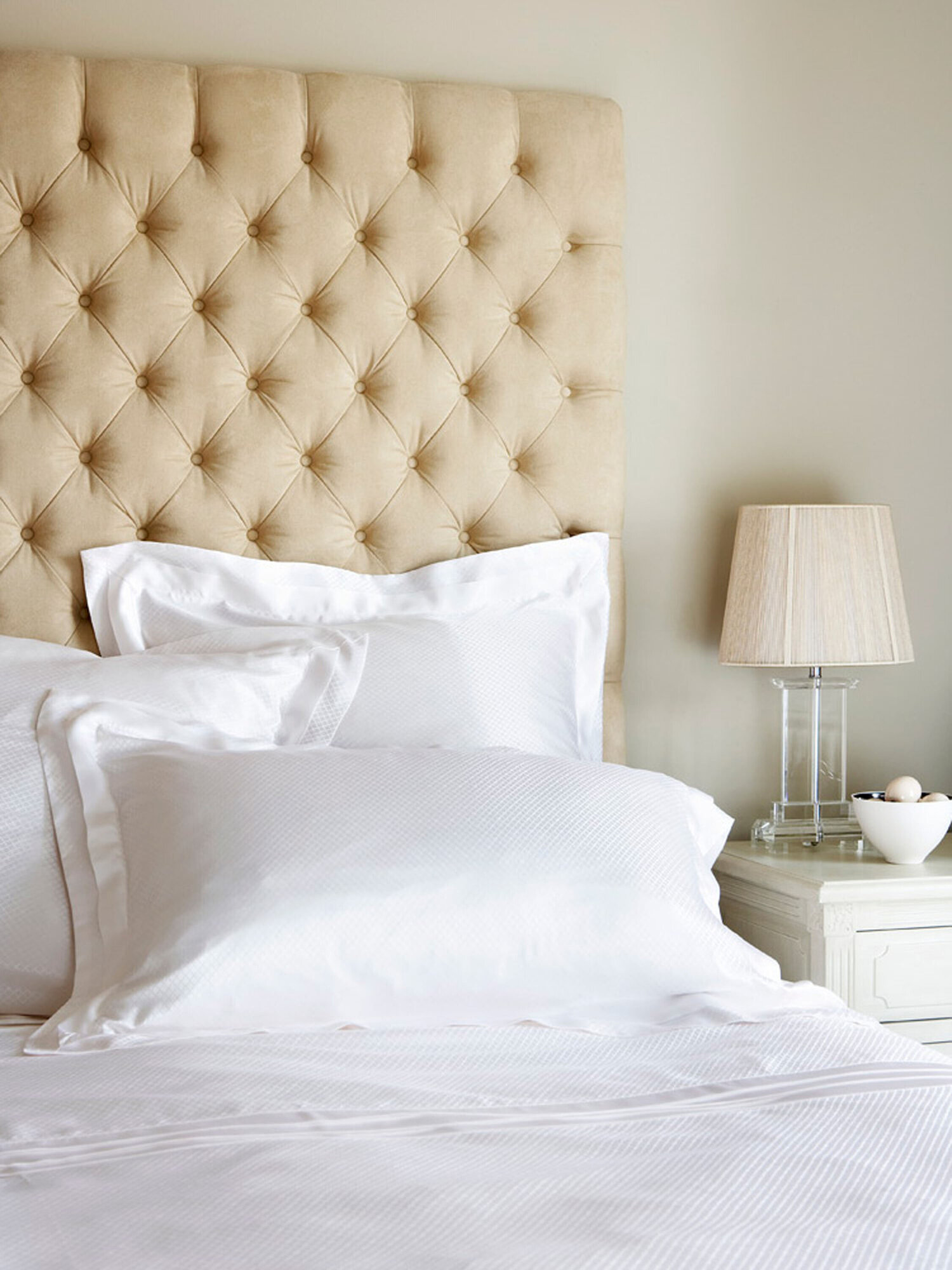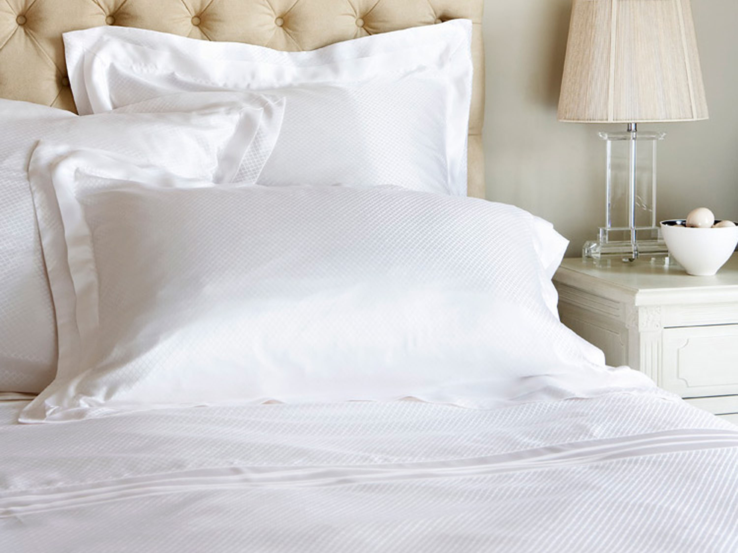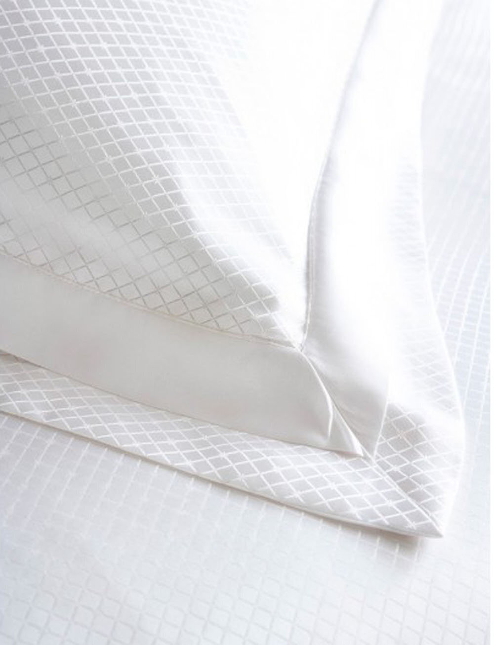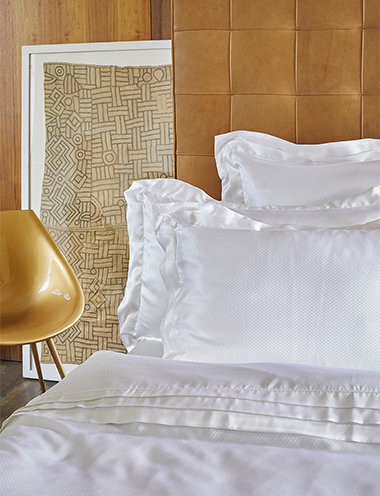 Роскошная коллекция постельного белья Eva из белого шелка; на наволочке двойная окантовка с дополнительным простым белым клапаном привносит легкость женственности и элегантности. Эта деталь отражена на пододеяльнике, где по всей ширине одеяла в верхней части проходит тройной белый кант.