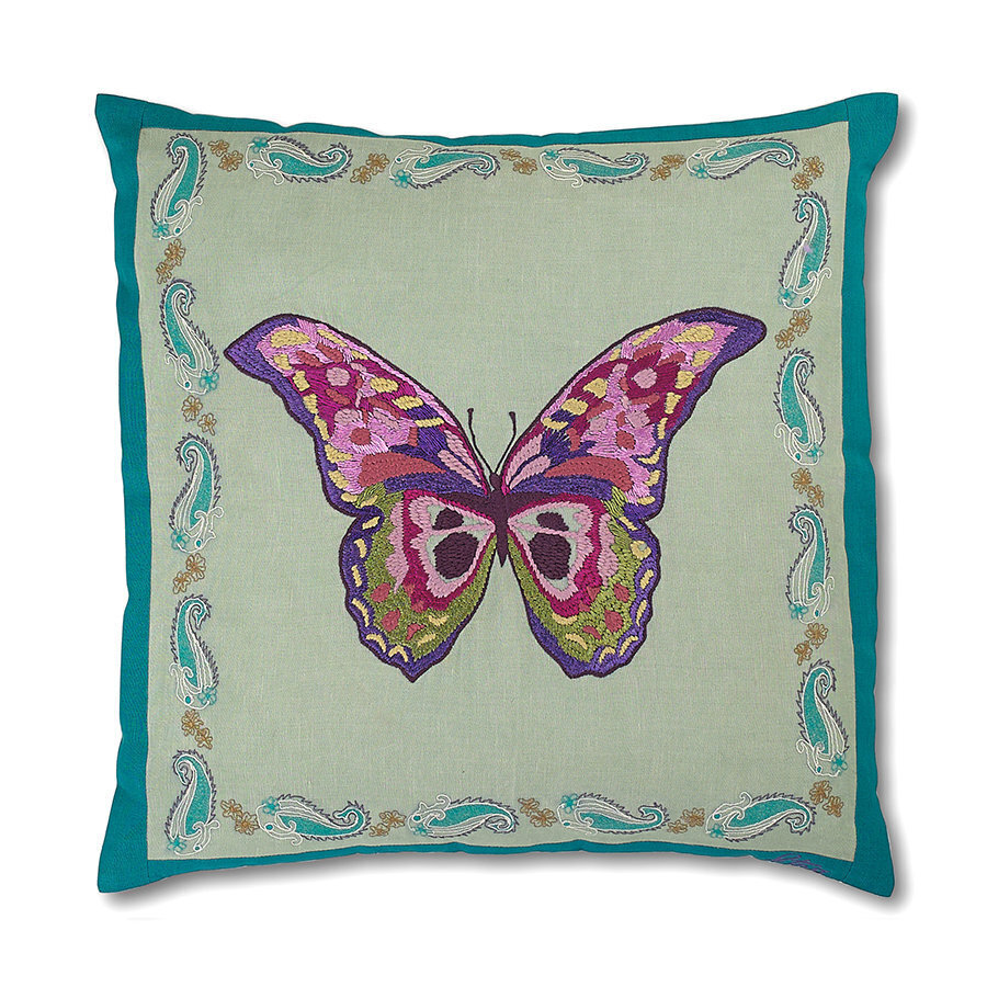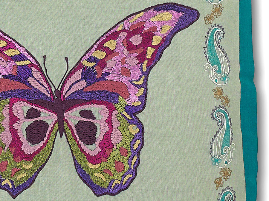 Центром дизайна "Langan" является большая бабочка, которая богато, подробно вышета в пресной фиолетовом, розовом и зеленых тонах. Она обрамлена тонкими пейсли -элементами, что гармонирует с широкой рамкой.