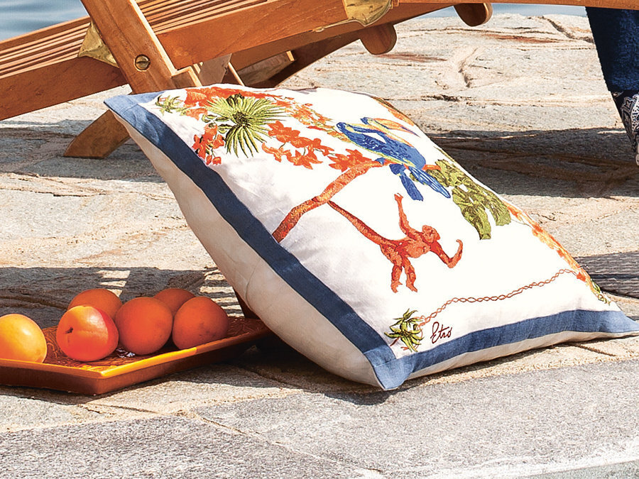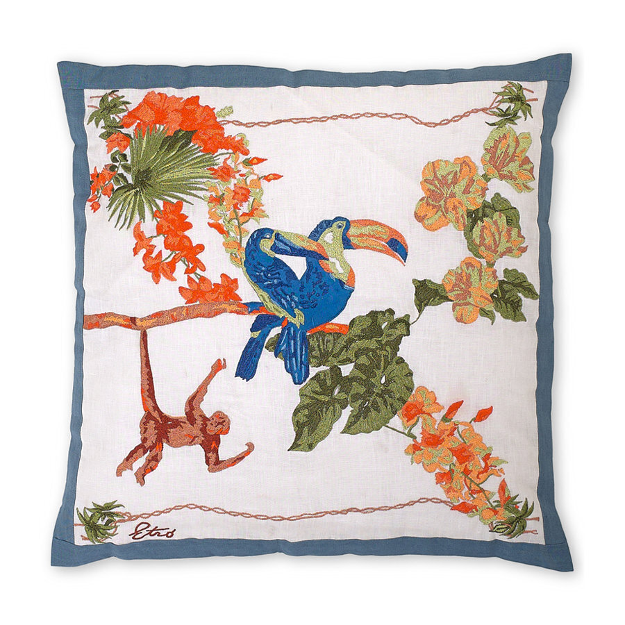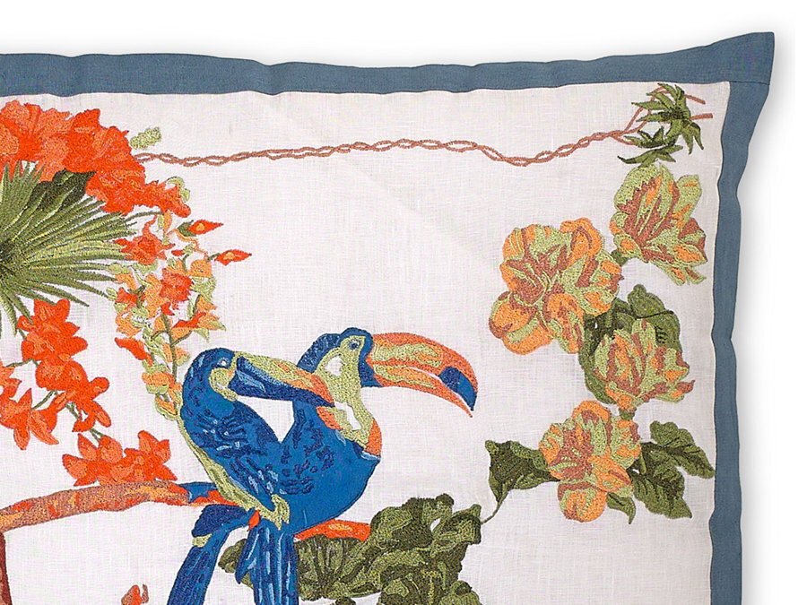"New Castle" приносит экзотику в ваш дому! Фрелиха, туканы, и обезьяна в раю растений резвятся на подушке. Мотив вышивки выполнен в различных ярких тонах на чистом белом, что придает ей дополнительный свежий вид.