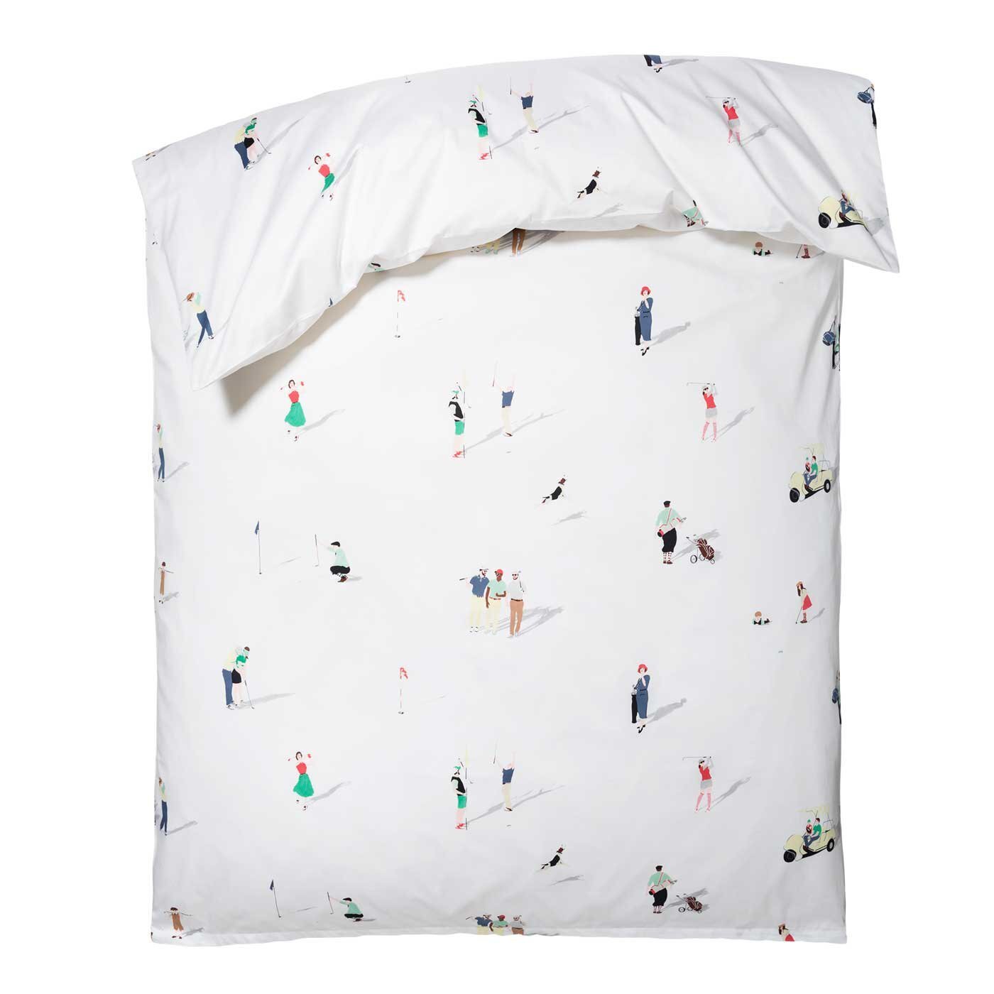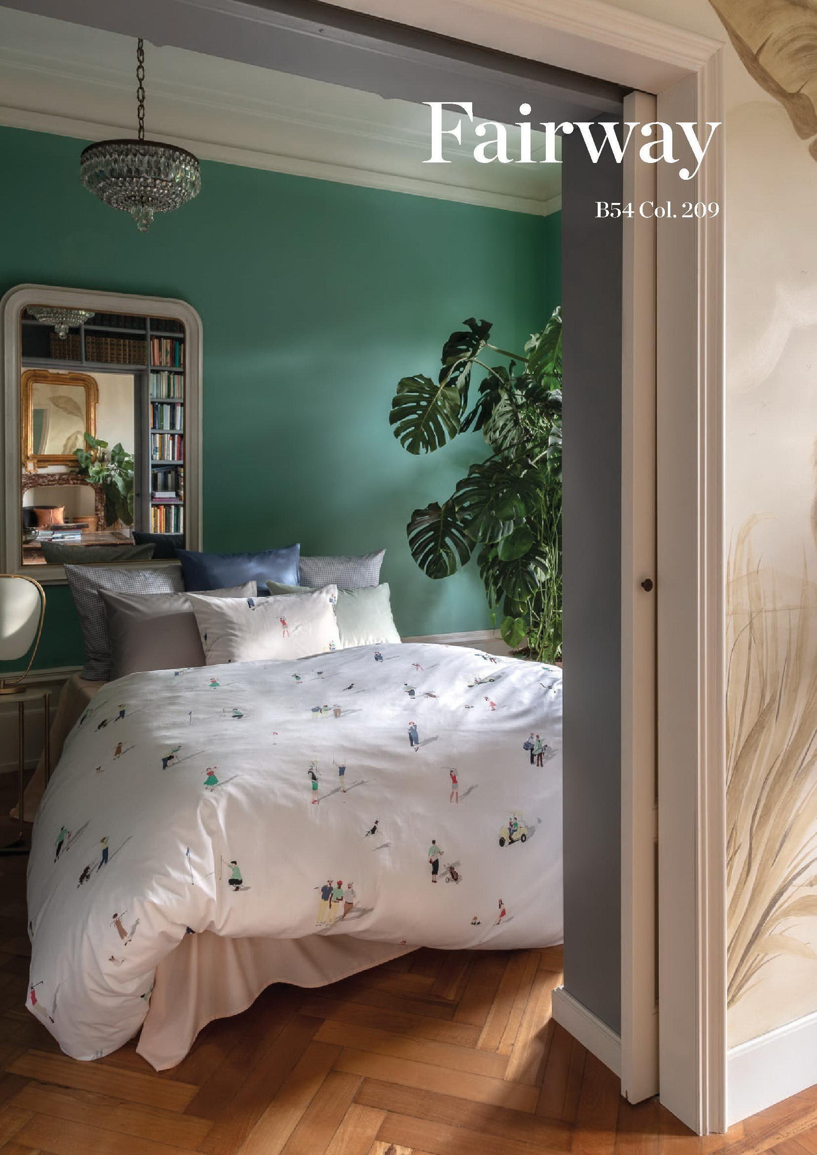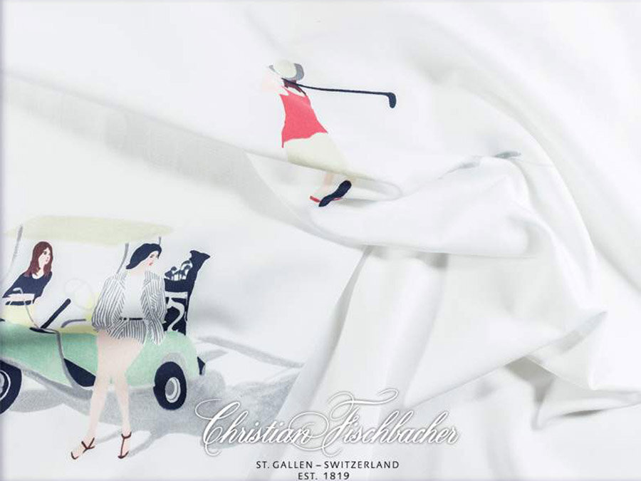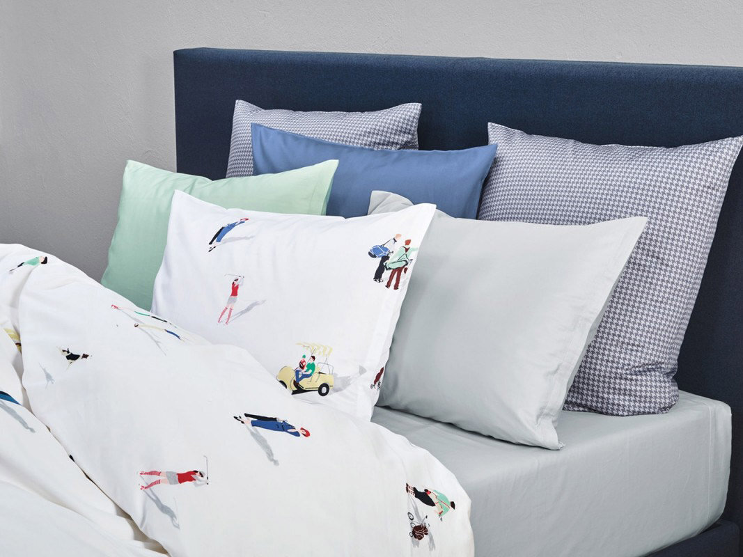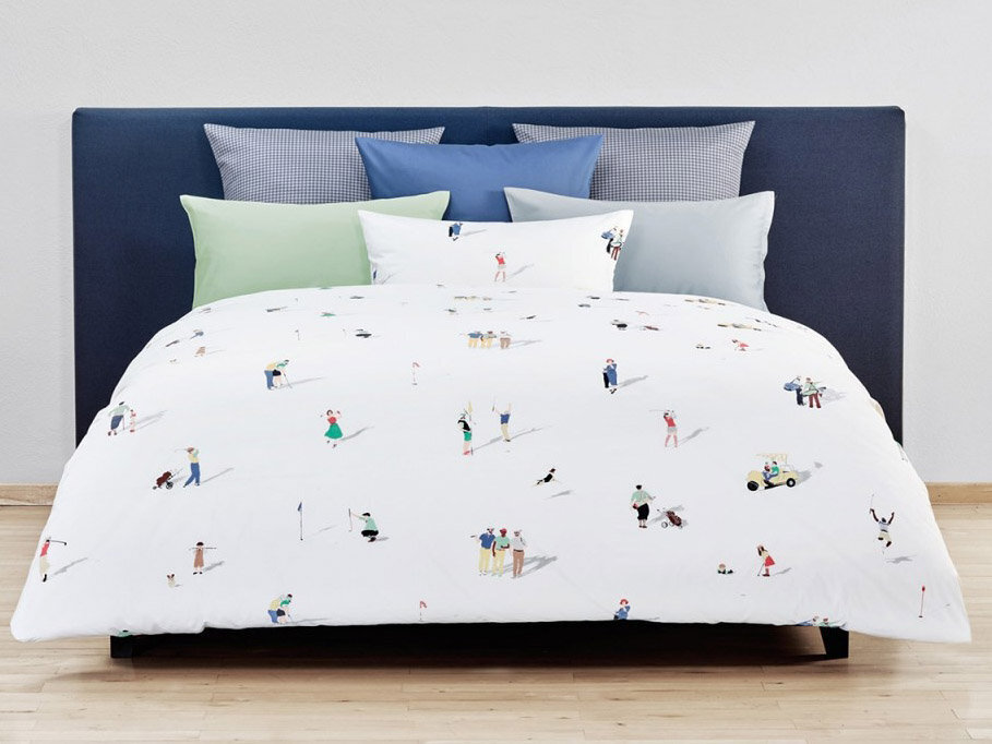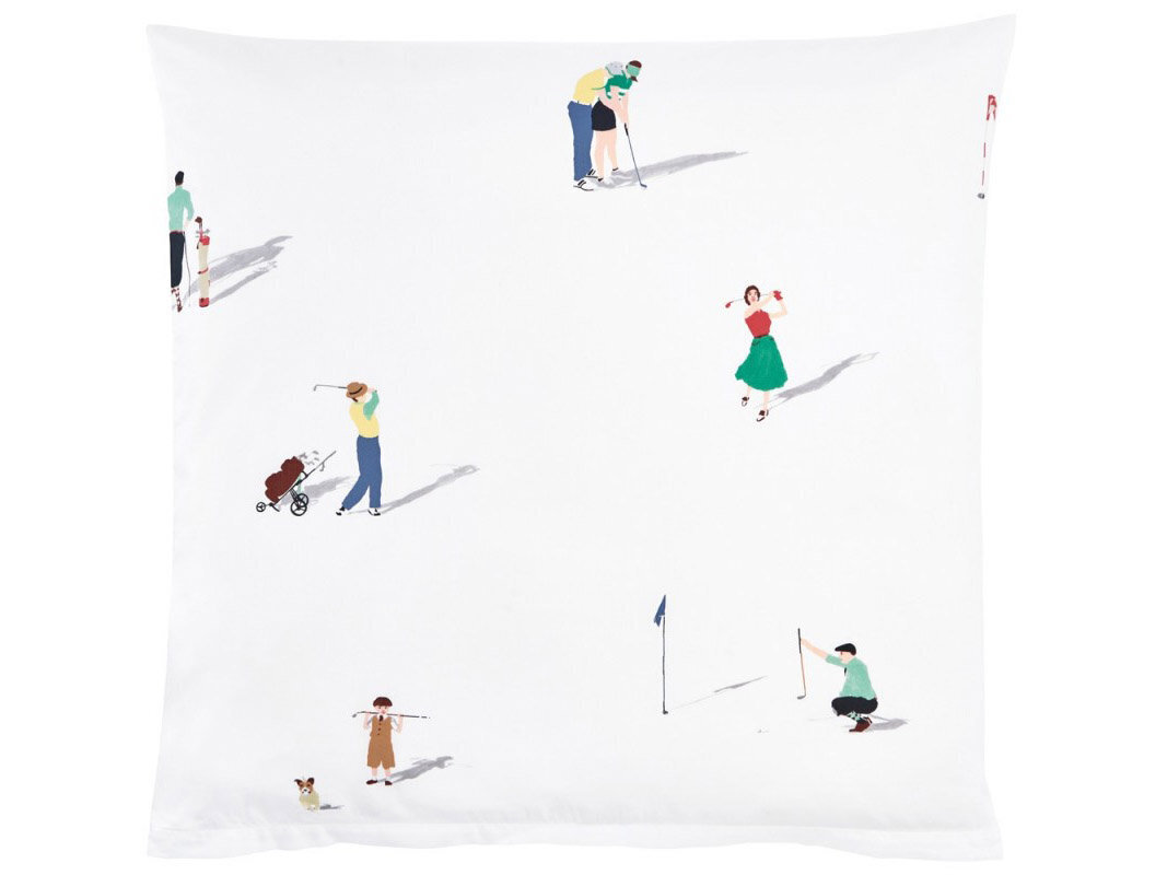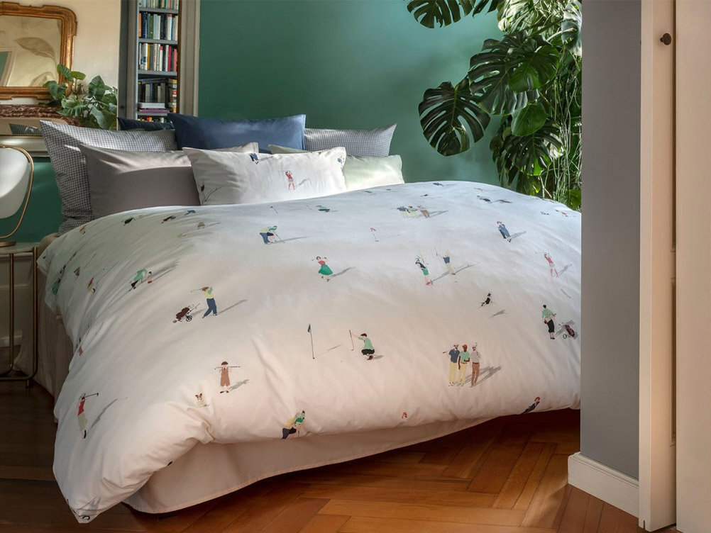Дизайн постельного белья FAIRWAY привлекает внимание не только любителей гольфа. Сделанный из лучшей швейцарской + хлопчатобумажной ткани, мотив напечатан с использованием 12 шаблонов. В гольфе фарватер - это аккуратно скошенная область между тройником и зеленью. В этом дизайне, написанном темперой, изображены двумерные фигуры, которые весело играют в гольф, собаки берут мяч для гольфа, а женщины радостно болтают, опираясь на клюшку для гольфа. Тени создают иллюзию игроков, стоящих на постельном белье.