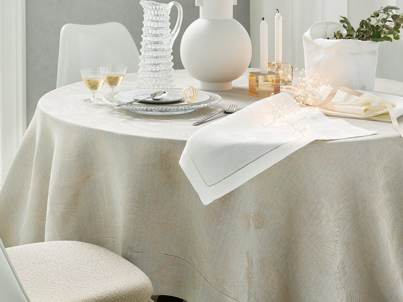 Легкий жаккардовый рисунок на слегка пестром фоне придает вашему столу празднично элегантный штрих.