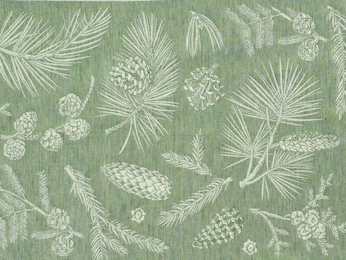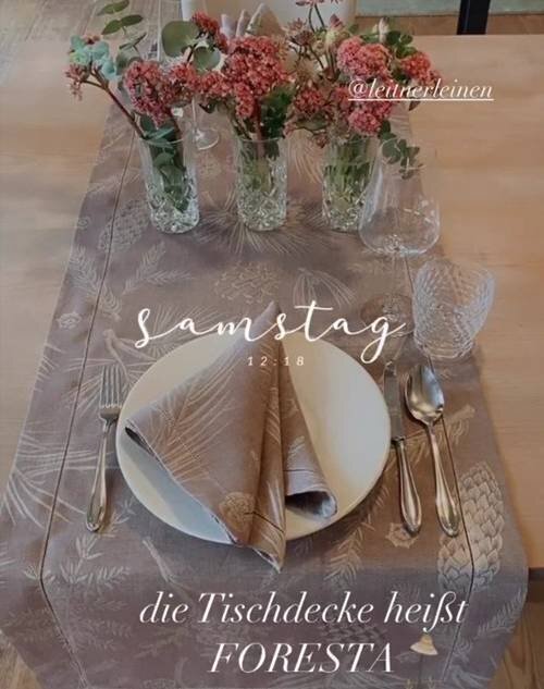 Декоративная скатерть, салфетки, сеты под тарелки от Leitner Leinen с красивым дизайном FORESTA- это особенная приманка для накрытого стола, очаровывает своим великолепным декором из разных хвойных деревьев с шишками, таких как сосна, дерево жизни Хиба, лиственница, можжевельник, пихта и пихта Дугласа. Leitner Leiner с мастерской точностью плетет пряжу из европейского льна и тонкого хлопка - из пряжи высшего качества с тончайшими нюансами.