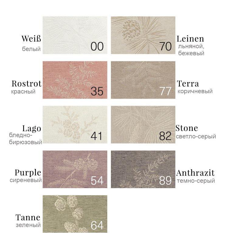 - коллекция FORESTA дополнительно включает: полульняные кухонные полотенца 50х70 см , льняные салфетки 47х47 см, сеты под тарелку 38/50, 44/56 см, скатерти