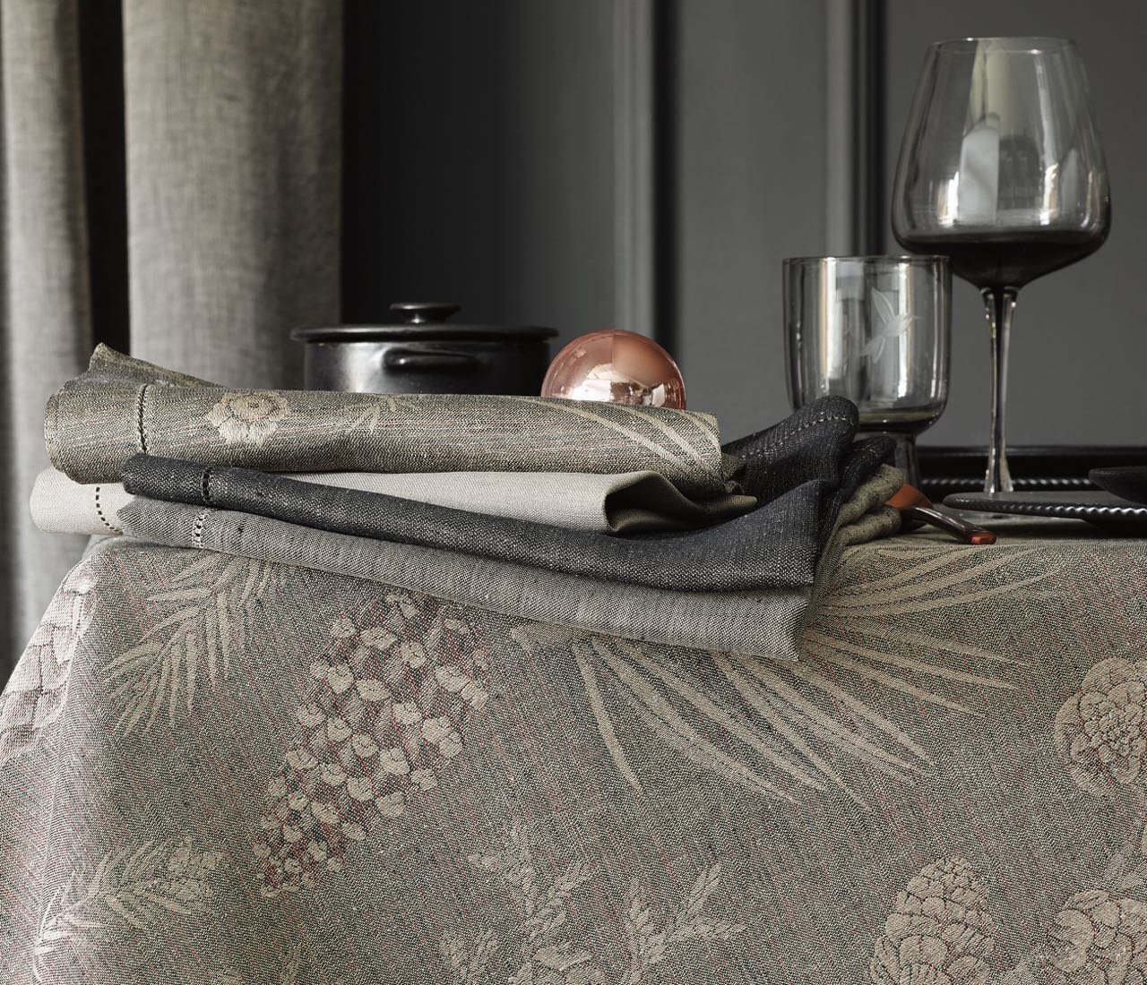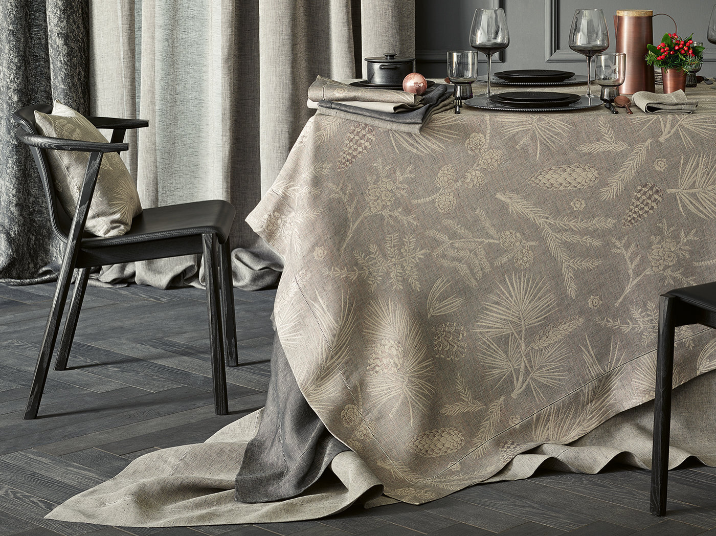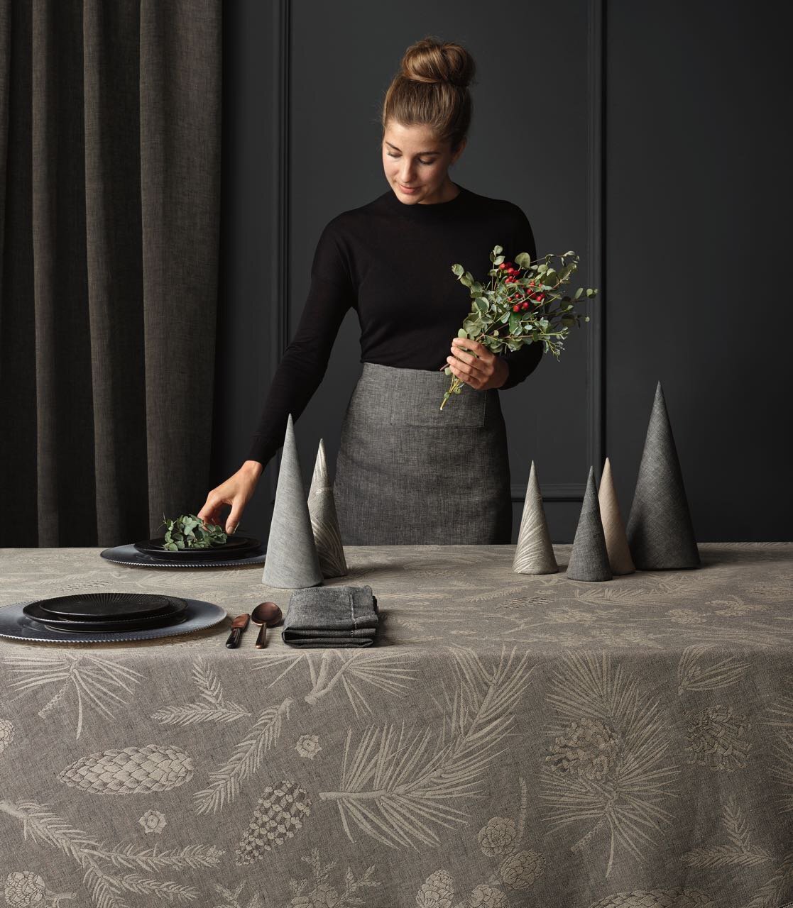 Декоративная скатерть от Leitner Leinen с красивым дизайном FORESTA- это особенная приманка для накрытого стола, очаровывает своим великолепным декором из разных хвойных деревьев с шишками, таких как сосна, дерево жизни Хиба, лиственница, можжевельник, пихта и пихта Дугласа. Leitner Leiner с мастерской точностью плетет пряжу из европейского льна и тонкого хлопка - из пряжи высшего качества с тончайшими нюансами.