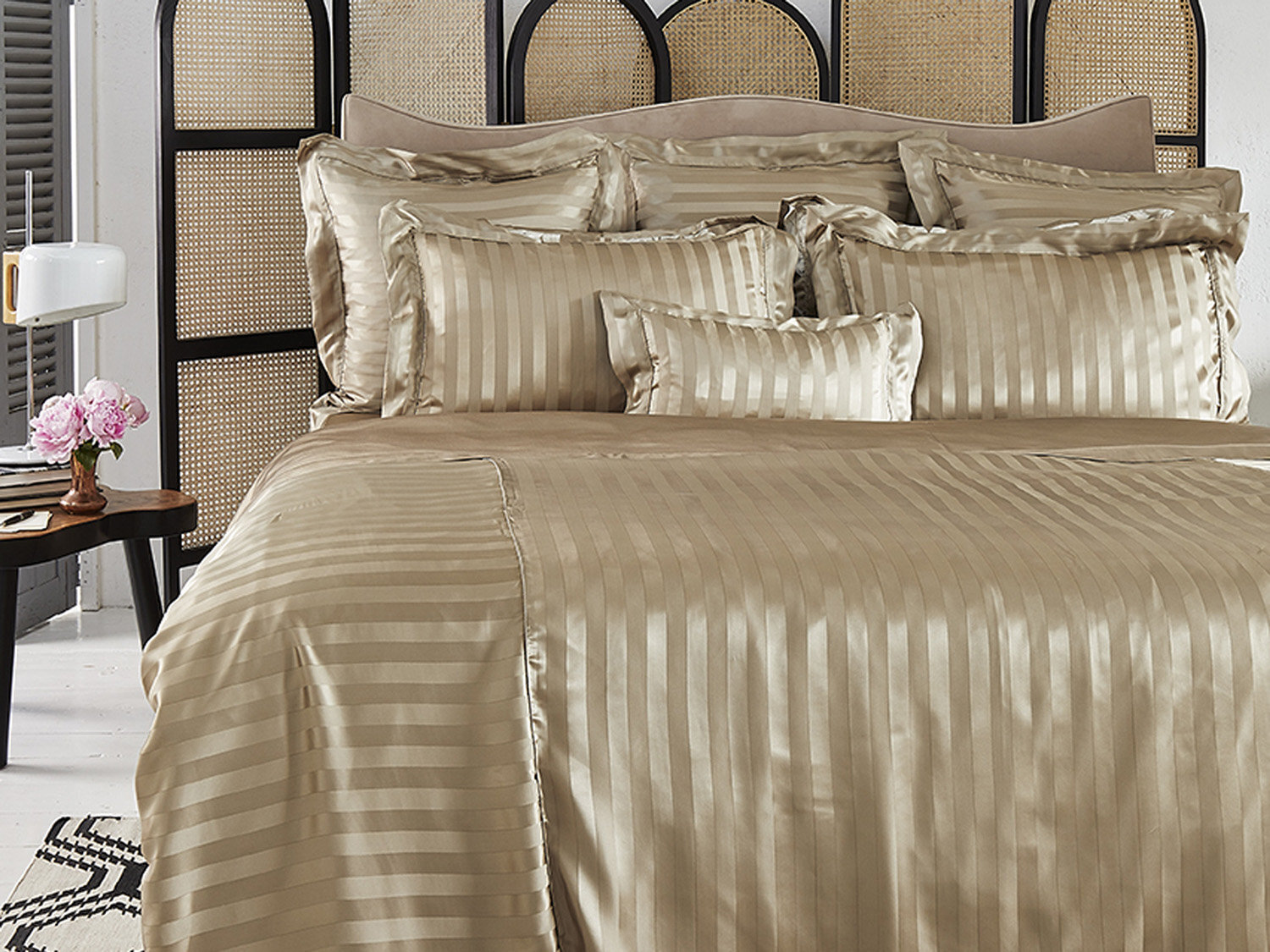 Роскошное постельное белье FRASER STRIPE SAND - это мода для дома! Fraser Stripe представляет собой современный образец классической полоски с полосками в песочной цветовой гамме с элегантной отделкой по краям вокруг наволочек и пододеяльников.