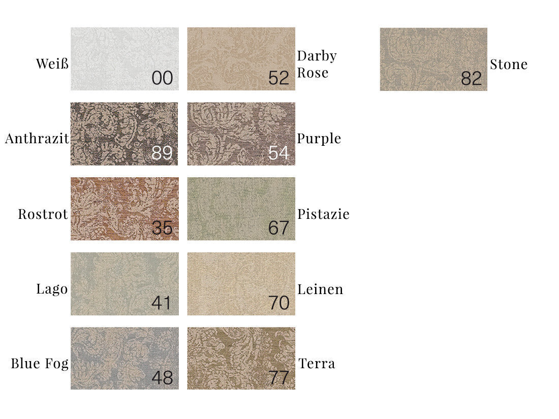 Цвет: 00 (белый), 35 (красный, красно-коричневый), 41 (бледно-бирюзовый), 48 (голубой), 52 (розовый), 54 (сиреневый), 67 (фисташковый зеленый), 70 (льняной), 77 (коричневый), 82 (светло-серый), 89 (темно-серый, антрацит)