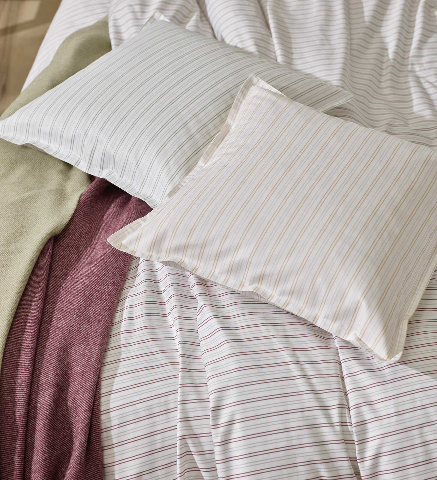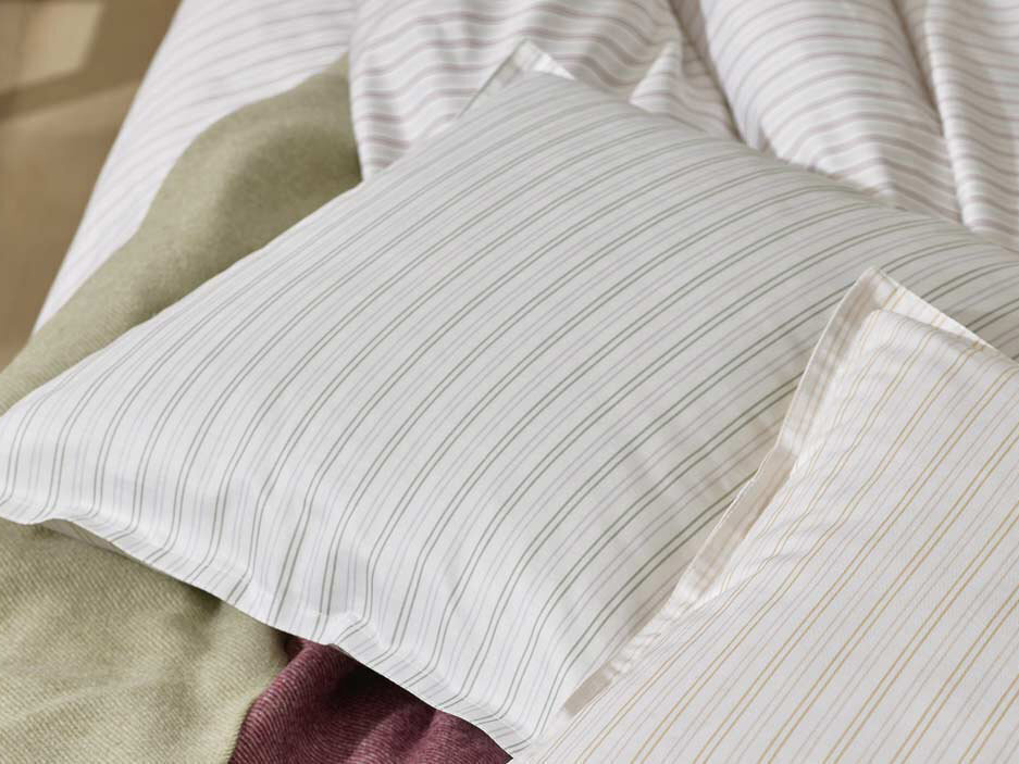 Тонкие полоски расположены в двойные полосы и легко, воздушно смотрятся особенно светлы на светлом фоне. Наволочки на подушку выполнены с четырехсторонним декоративной гладкой кромкой ("ушками").