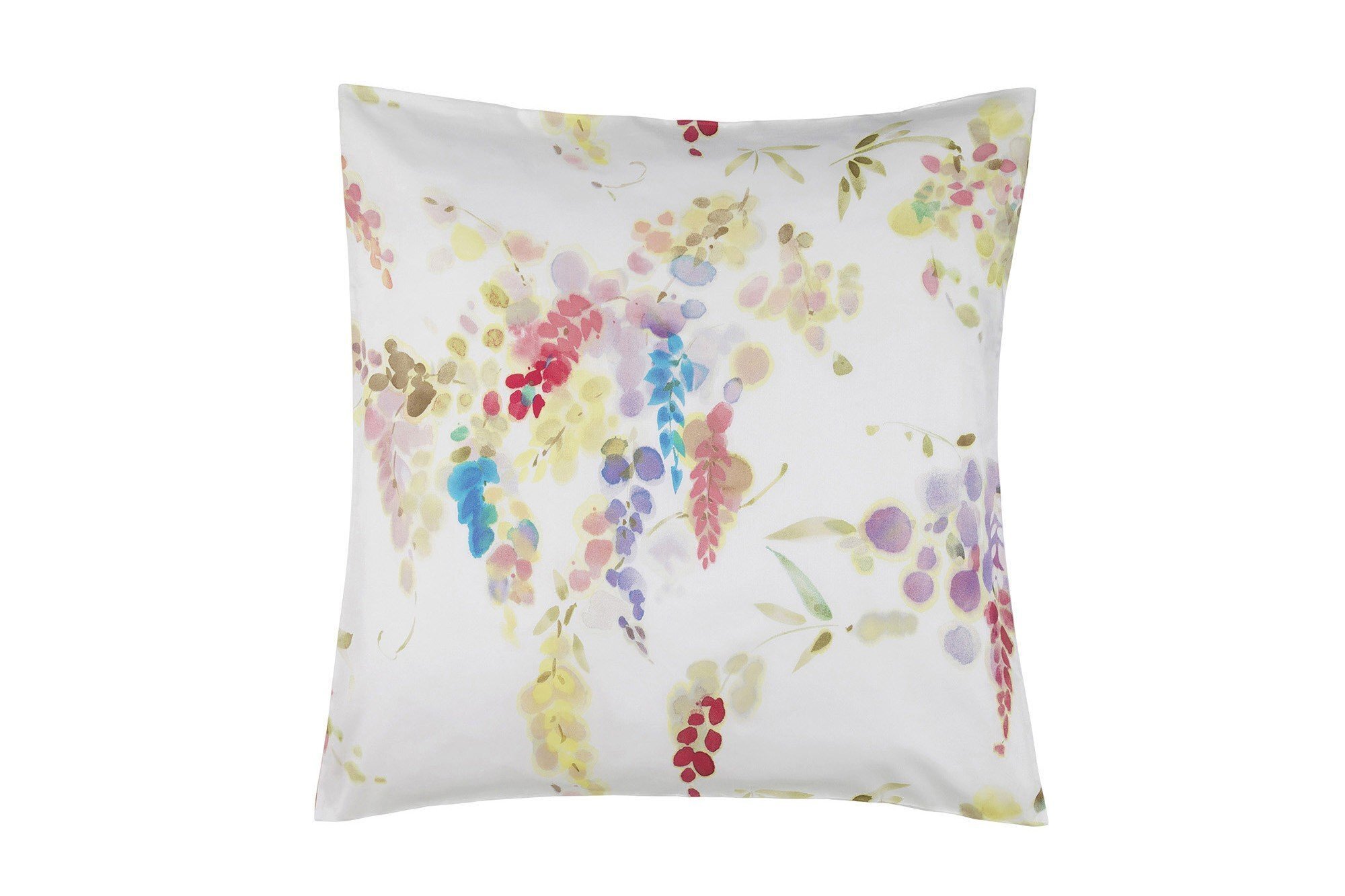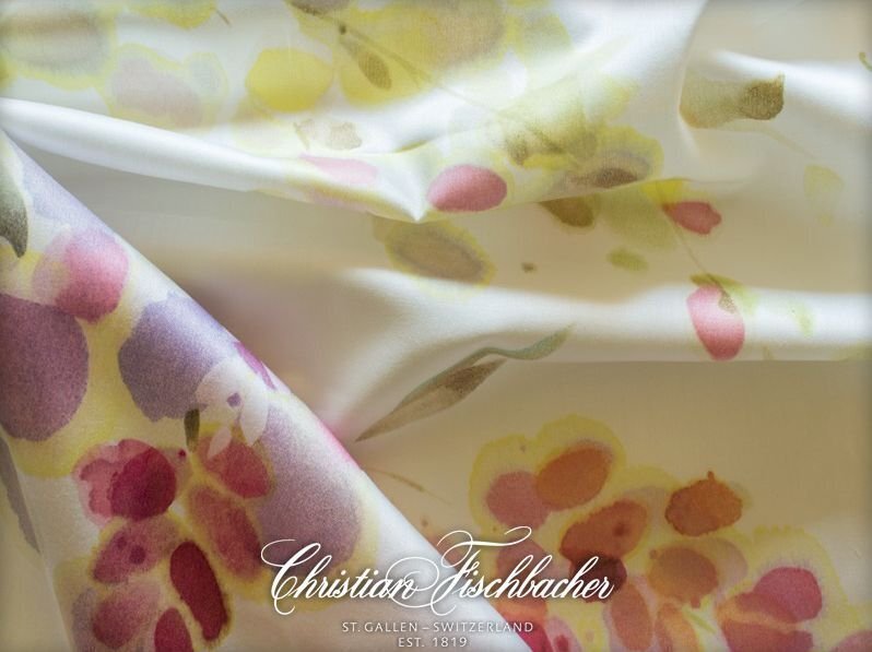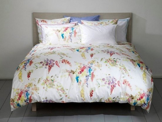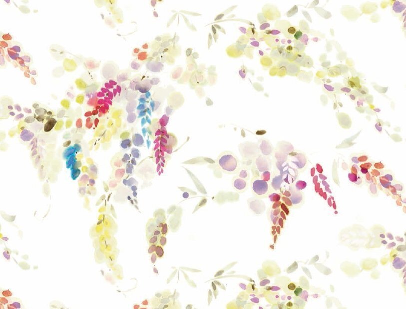 Этот цветочный современный и выразительный дизайн в ввиде акварельных веток Глицинии создан наложением 12 трафаретов на высококачественный швейцарский сатин.