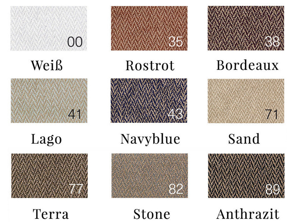 Цвет: 00 Weiss (белый с белым), 35 Rust Red (красно-коричневый с льняным тоном), 38 Bordeaux (бордовый с льняным тоном), 41 Lago (бледно-бирюзовый с льняным тоном), 43 Navyblue (темно-синий с льняным), 71 Sand (песочный с льняным тоном), 77 Terra (коричневый с льняным ), 82 Stone (светлый серо-голубой с натуральным льняным), 89 Anthrazit (темно-серый, антрацит с льняным)