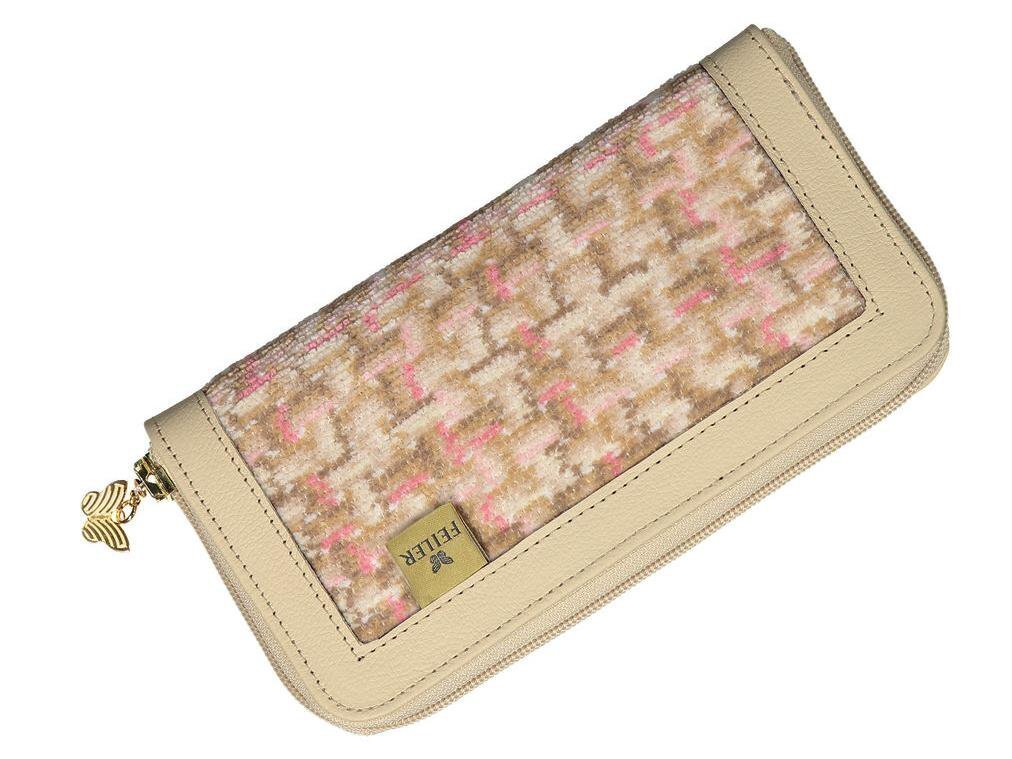 Вместительный кошелек с коженными вставками имеет отсек для монет с застежкой-молнией, слоты для карт и отсек для банкнот.