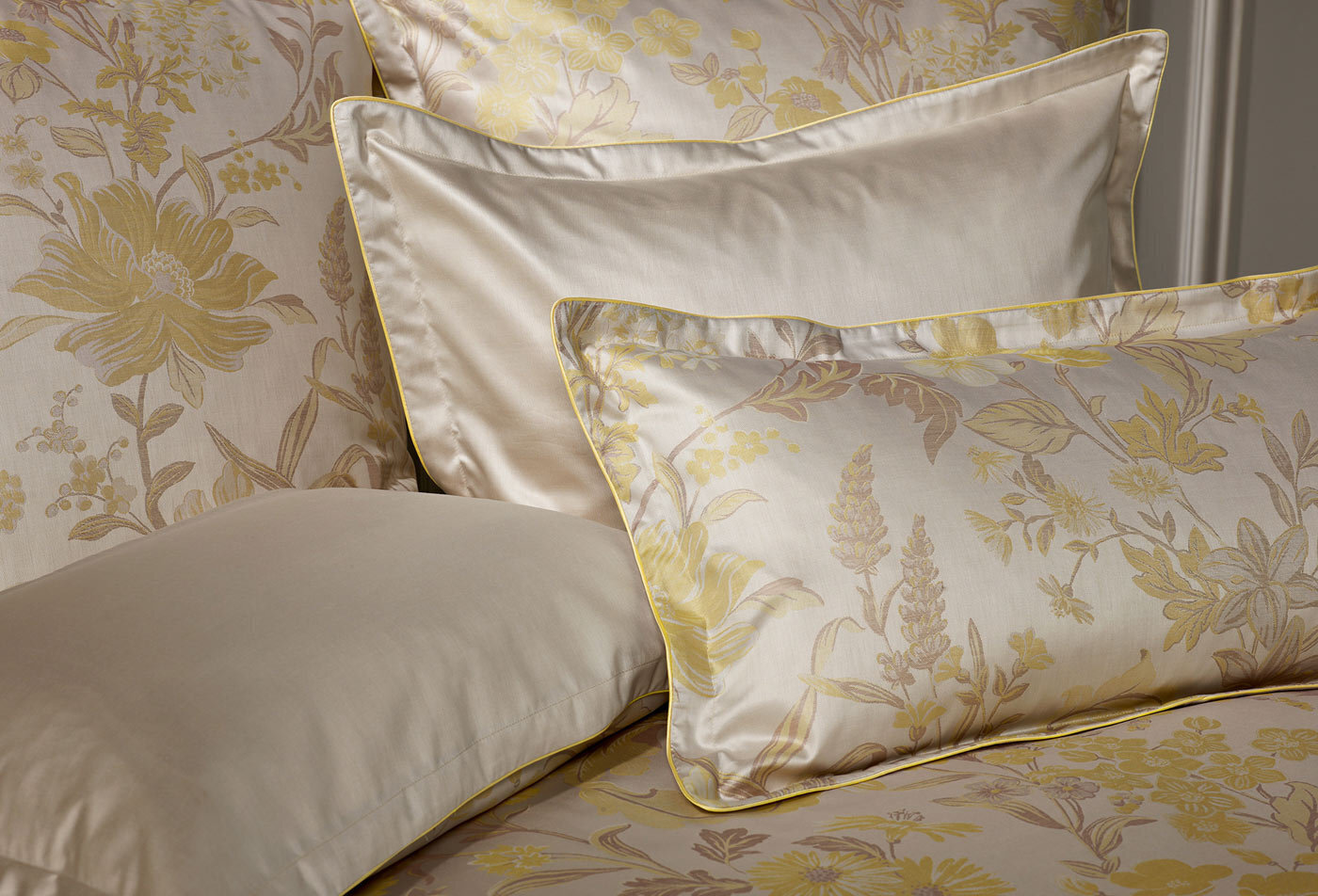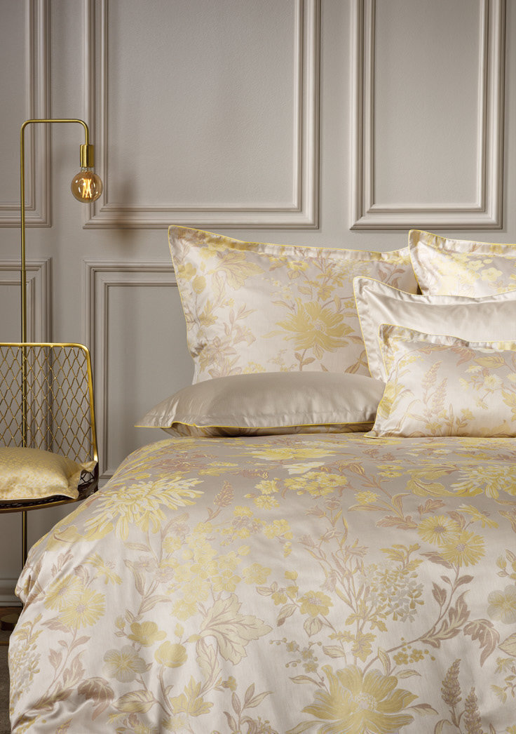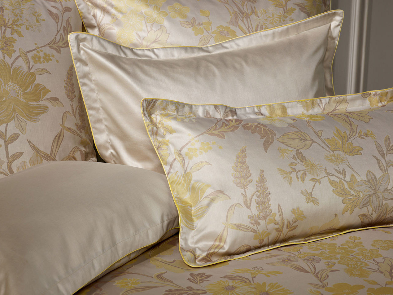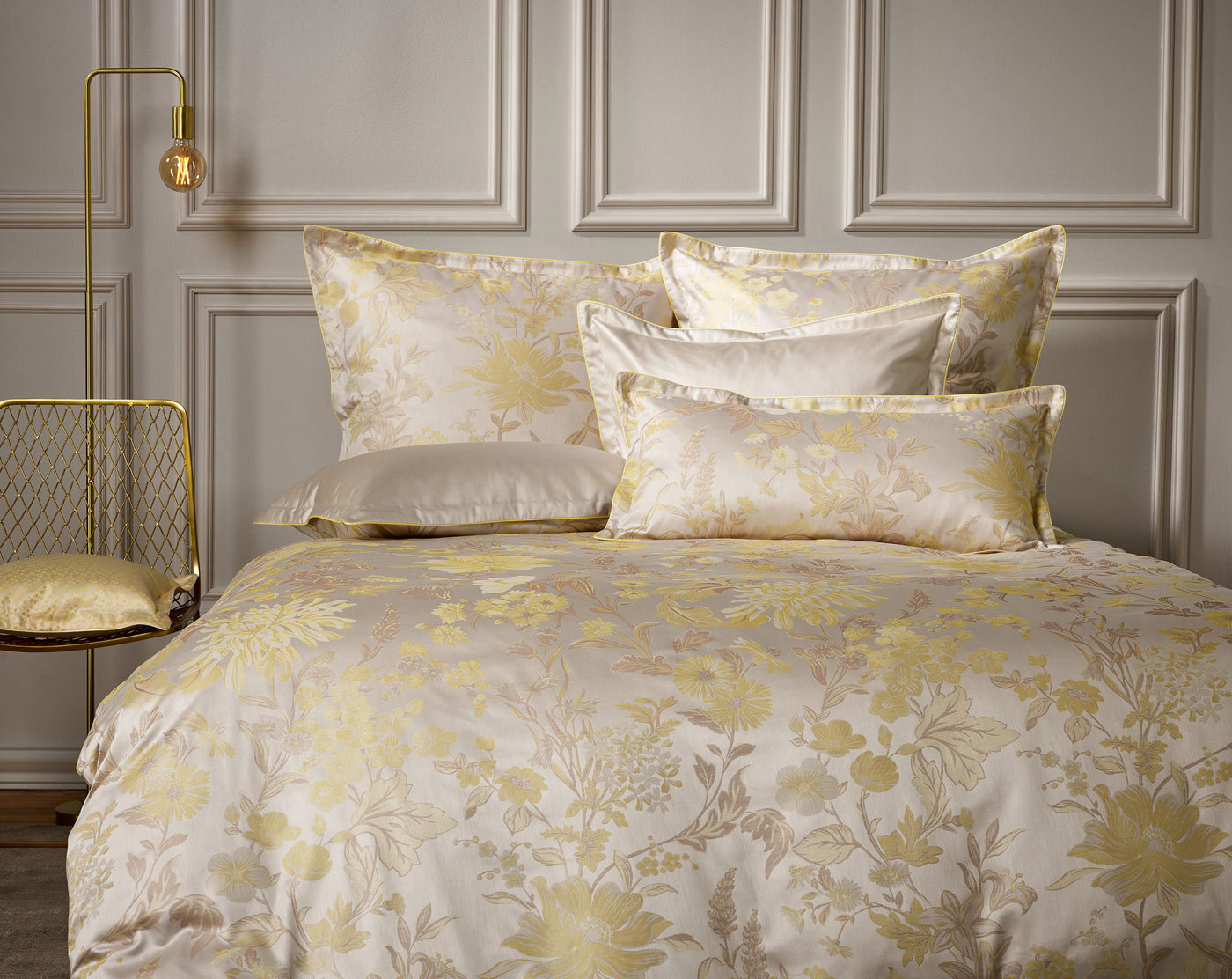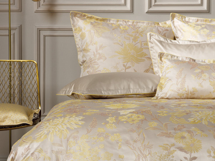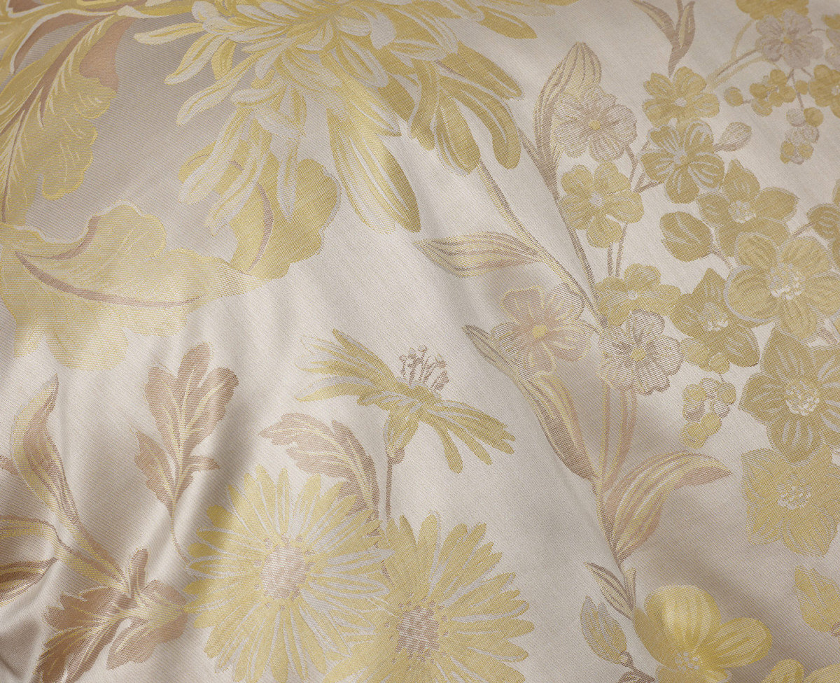 Это тонкое дамасское постельное белье имеет благородный блеск. Этот дизайн демонстрирует художественный цветочный тканый узор. Чехол на подушку обработан 4-сторонним стоячим швом и окантовкой. Однотонная спинка придает общему образу спокойный характер.