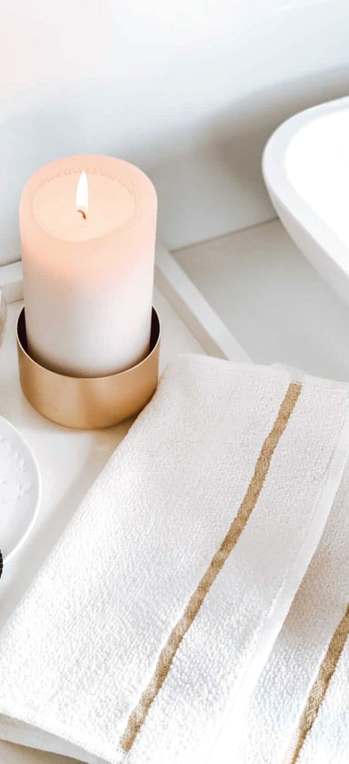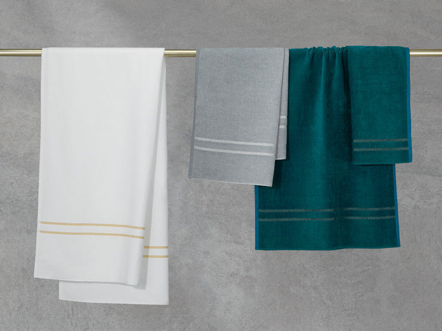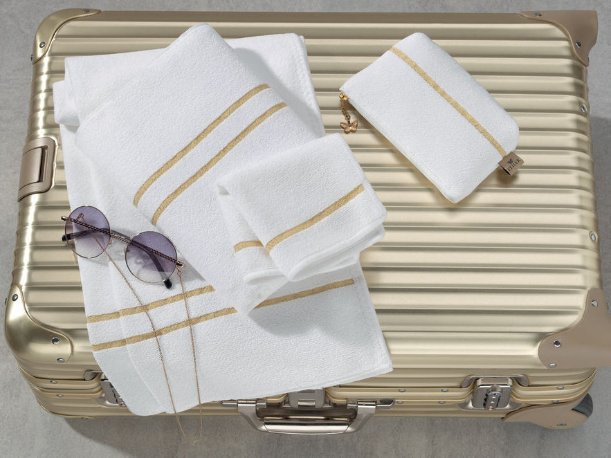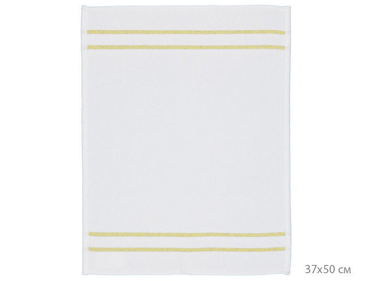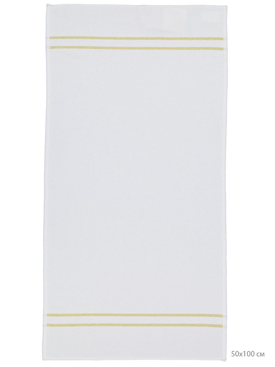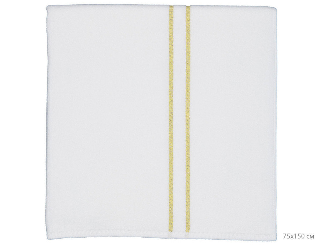 - Белый фон полотенца с узкими полосками в тоне золота