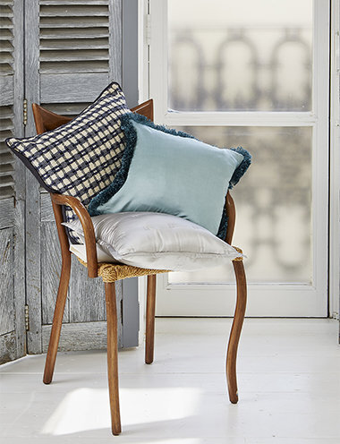 Сделанная из шелка спереди и бархата с обратной стороны, эта бирюзовая подушка обратима благодаря невидимой молнии, расположенной на бархатной стороне.