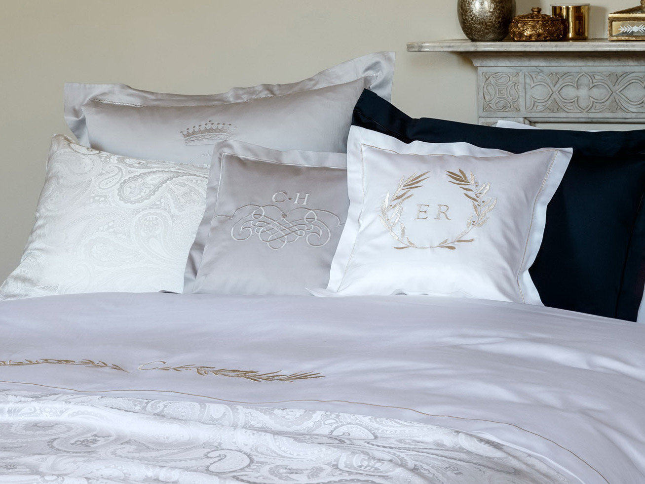 Для поистине царственного сна вы также можете оформить это эксклюзивное постельное белье с личной монограммой. Вышитые одной, двумя, тремя или четырьмя буквами, ваши инициалы становятся художественным украшением для пуховых одеял и подушек. С точки зрения цвета вы можете выбрать вышивку тоном на тон на белом, сером,синем фоне или золотую вышивку на белом фоне. С нашей типичной швейцарской страстью к качеству и нашим сложным вниманием к деталям мы адаптируем вашу монограмму к конкретным пропорциям вашего постельного белья и вышиваем ее вручную на благородном сатине 105.
