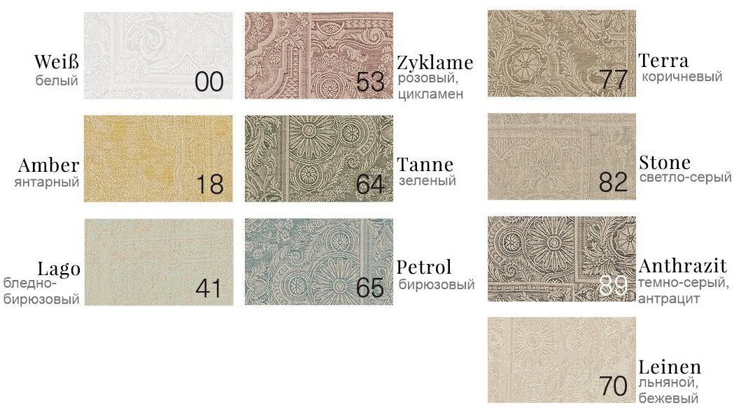 Цвет: 00 (белый), в сочетании с натуральным льном: 18 (янтарный), 41 (бледно-бирюзовый), 53 (цикламен / розово-фиолетовый), 64 (зеленый), 65 (бирюзовый), 70 (льняной), 77 (коричневый), 82 (светло-серый), 89 (темно-серый, антрацит)