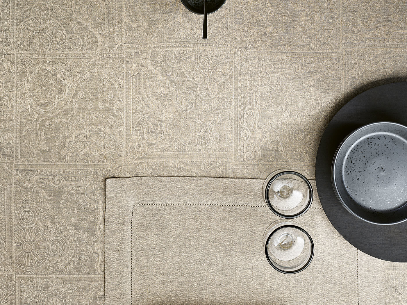 Легкий жаккардовый рисунок на слегка пестром фоне придает вашему столу празднично элегантный штрих.