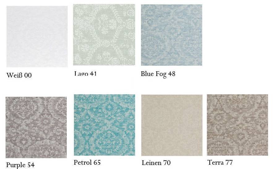 Цвет: 00 (белый), в сочетании с натуральным тоном льна: 41 (бледно-бирюзовый), 48 (голубой), 54 (сиренево-фиолетовый), 65 (бирюзовый), 70 (льняной), 77 (коричневый)