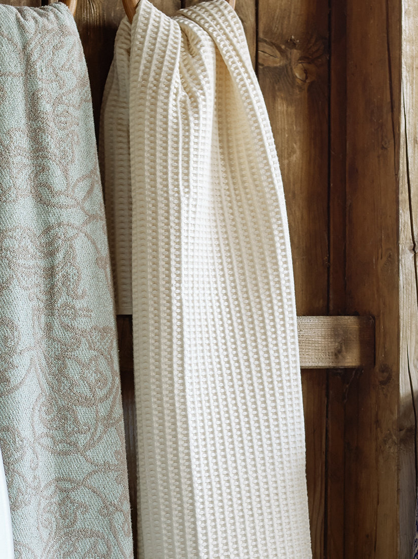 Пике Лейтнера сделан из чистого хлопка с сотканными сотами, которые создают четкую трехмерную структуру. Это создает воздушное ощущение на коже, которое образует очень приятное покрытие в жаркие дни и после спа-процедур. Легкая ткань идеально подходит для отдыха, сауны и спа.