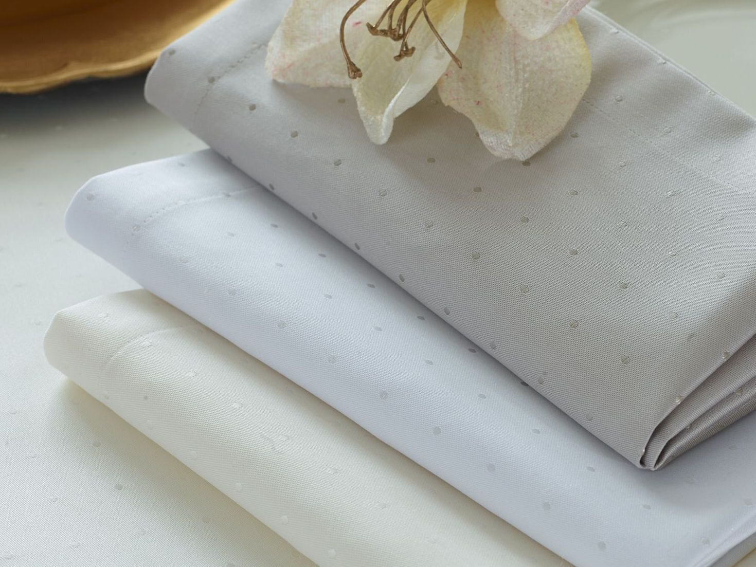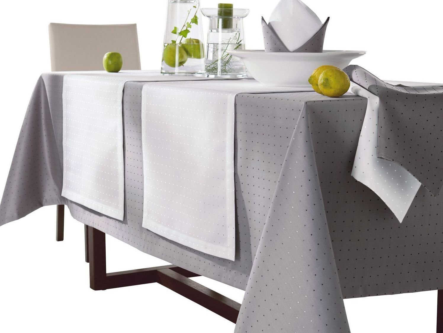 - Скатерть и салфетки с грязеотталкивающим эффектом. Ткань с защитой от пятен имеет специальную обработку, что уменьшает проникновение жидкостей или других загрязняющих веществ и облегчает удаление грязи.