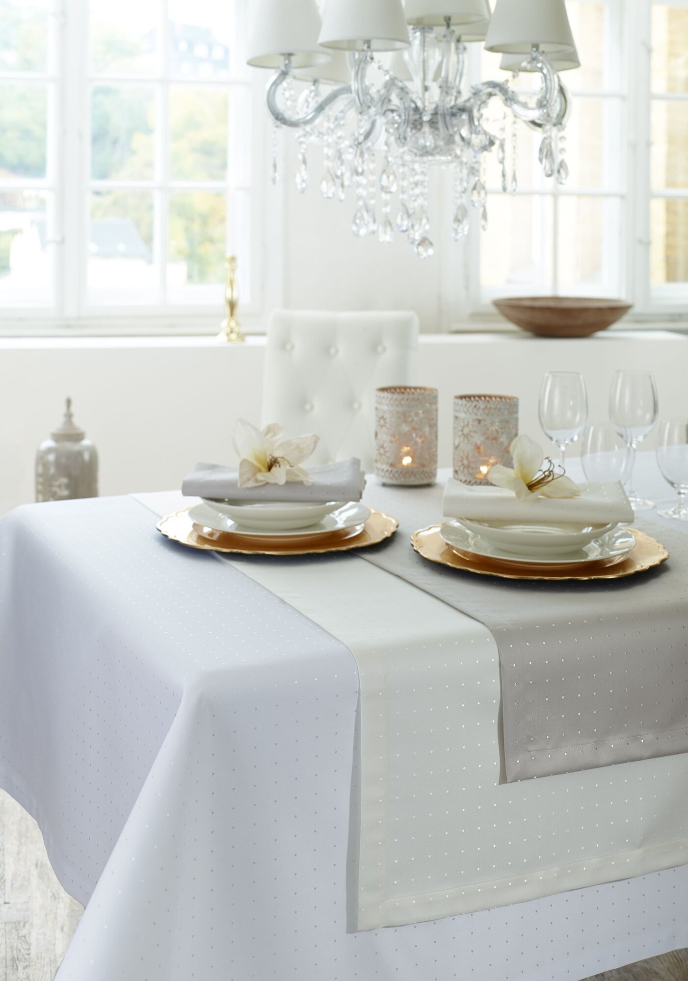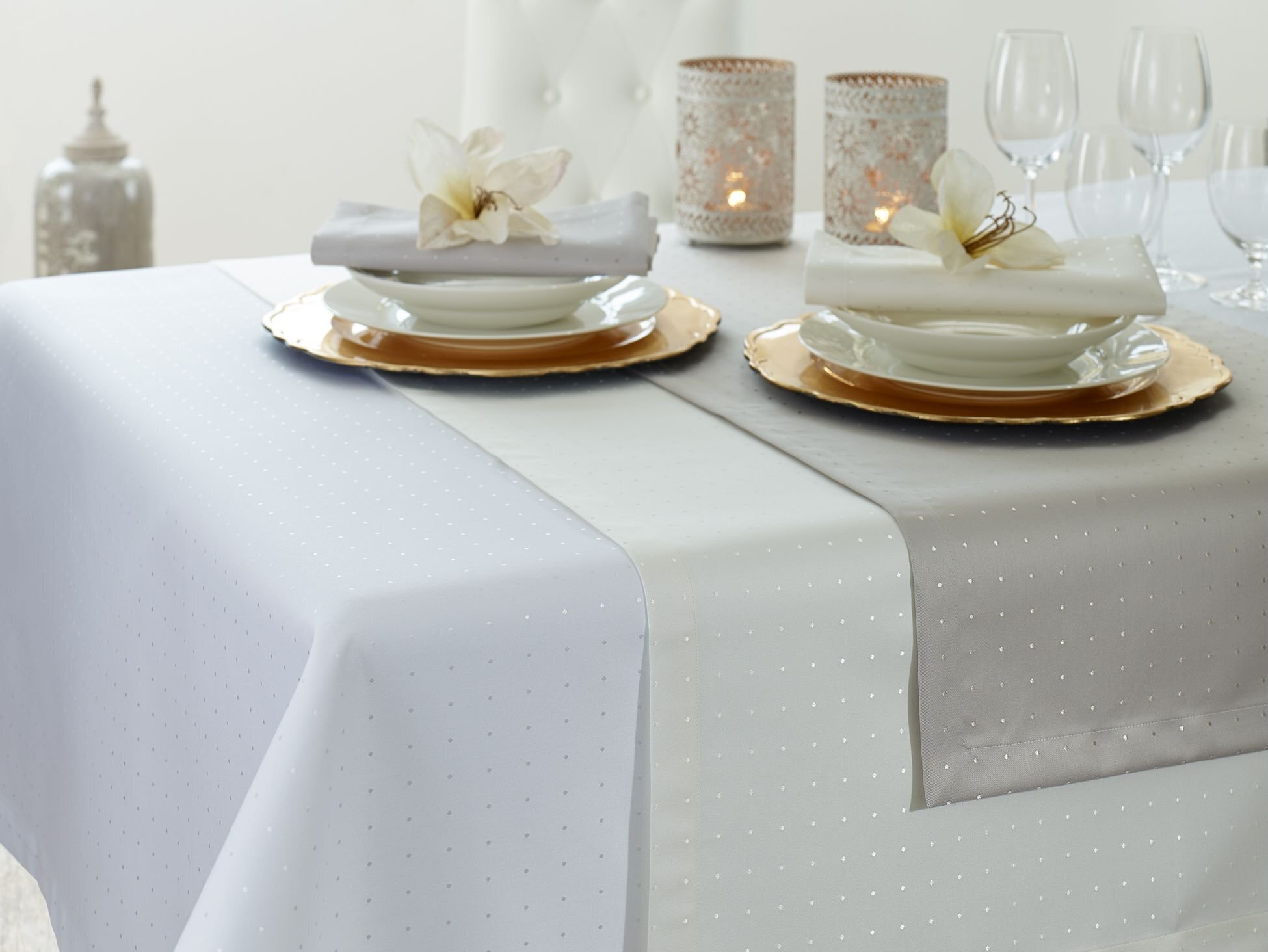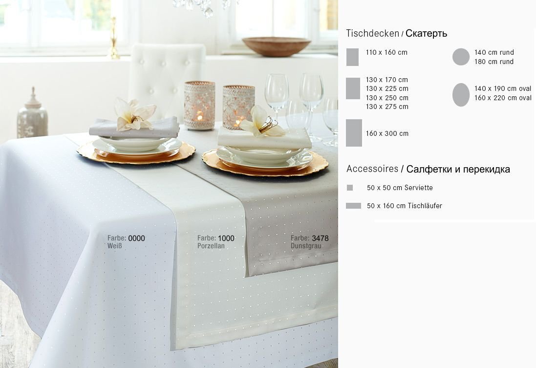 - Скатерти данной коллекции представлены в 4 цветах: 3478(dunstgrau) серый туман; 0000(weiss) белый; 3227(platin) платина; 1000(porzellan) фарфоровый