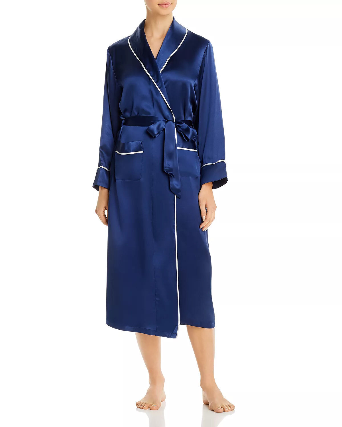 • Длинный крой и мягкость шелка для кожи делают этот халат исключительно удобным и идеальным в любое время года.