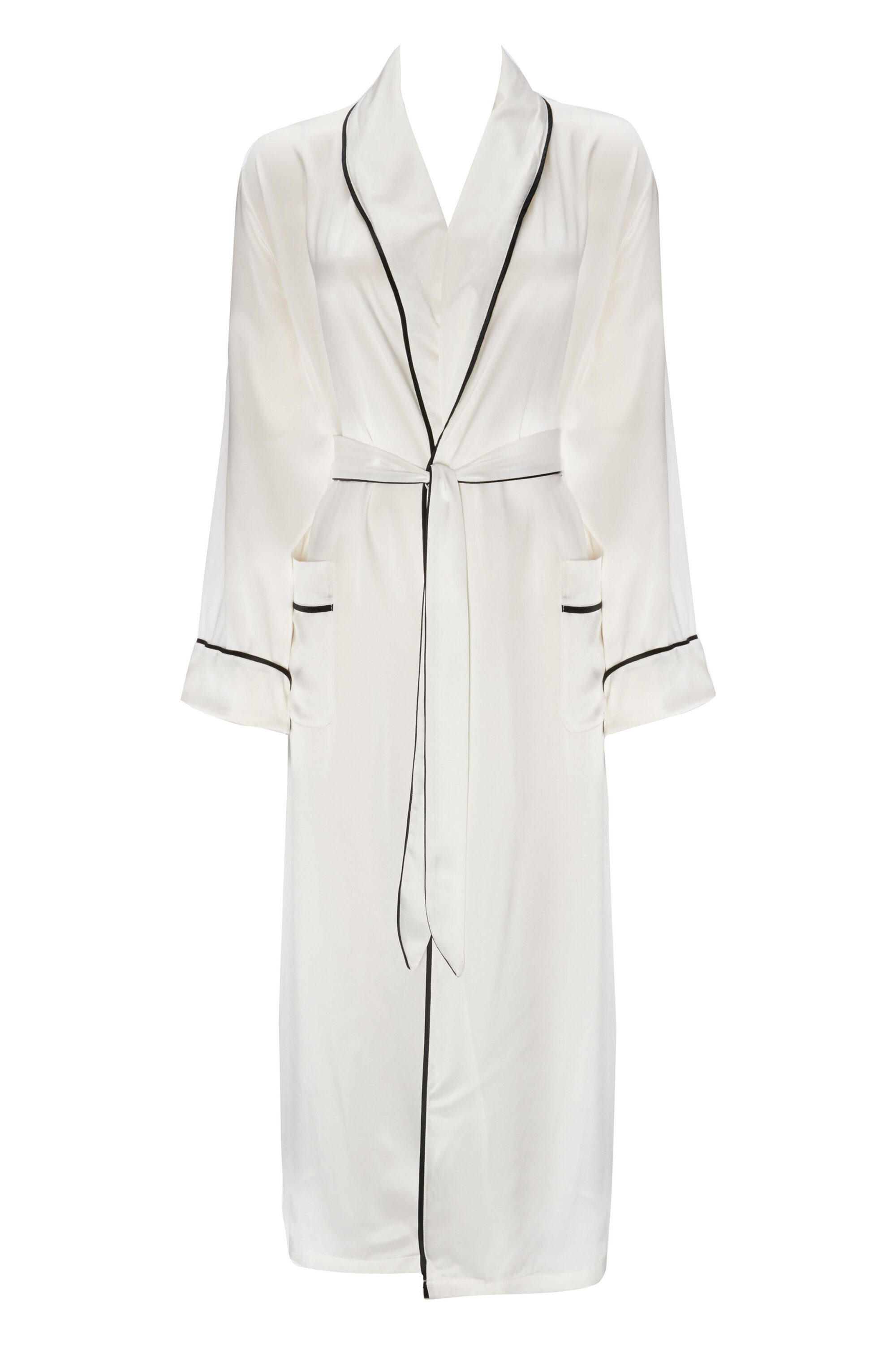 Халат из слоновой кости в классическом стиле, вневременной, с контрастным черным кантом и двумя карманами. Имеет пояс и внутренние завязки.