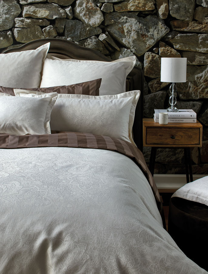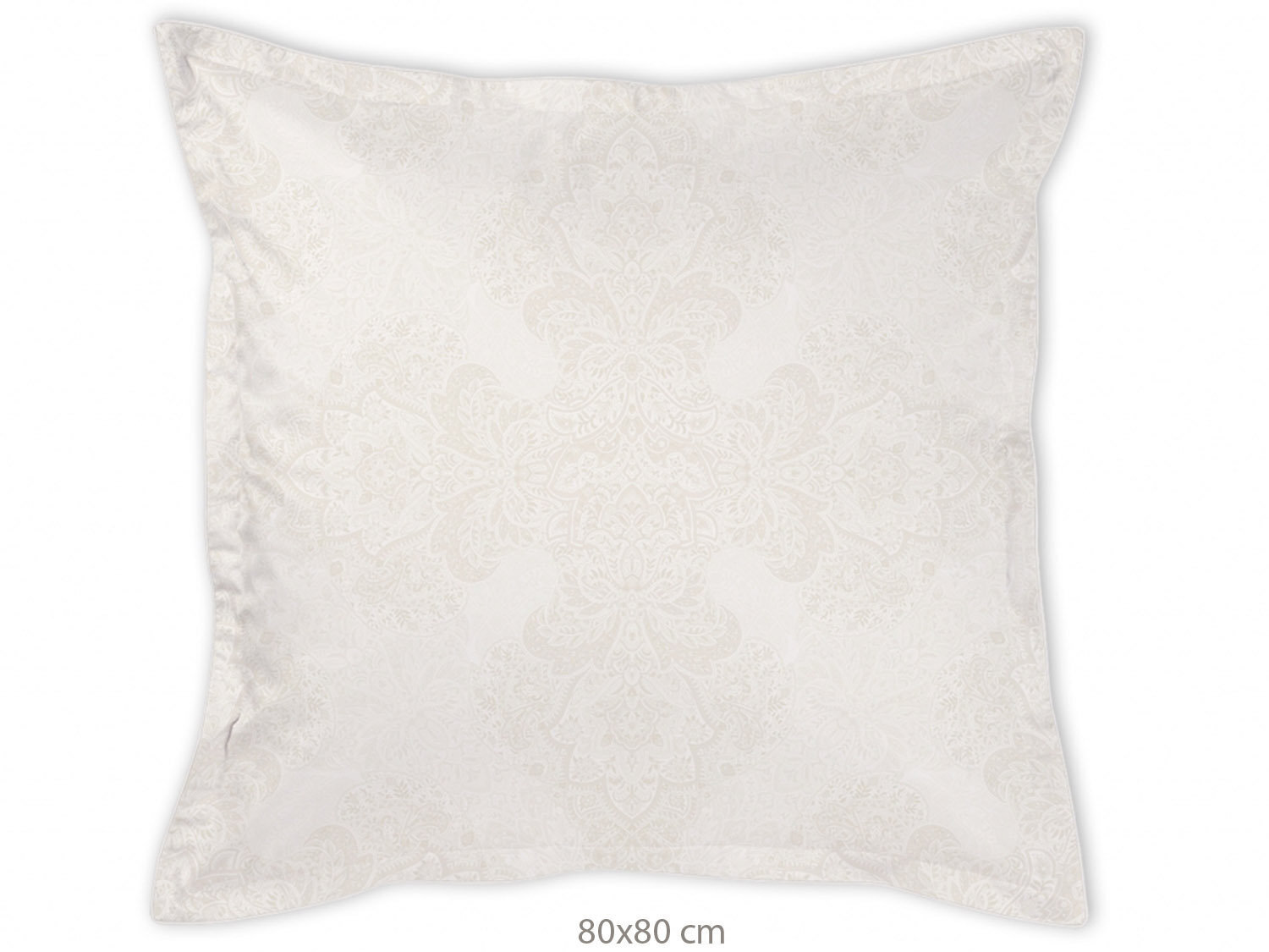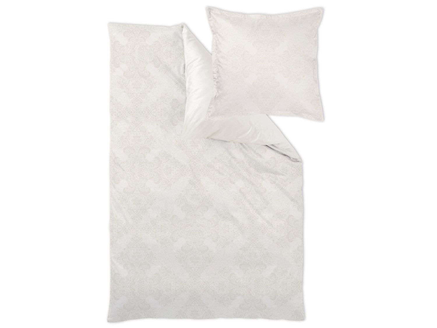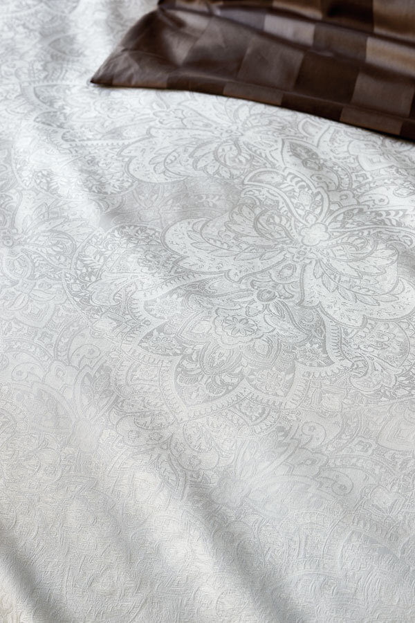 Этот высококачественный дизайн впечатляет абстрактным и тонким рисунком пейсли, который выглядит особенно элегантно в цвете не совсем белом. Наволочка сложная с 4-х сторонним подгибом (ушки) и окантовкой. Простые однотонные "спинки" подушки и пододеяльника делают внешний вид очень благородным.
