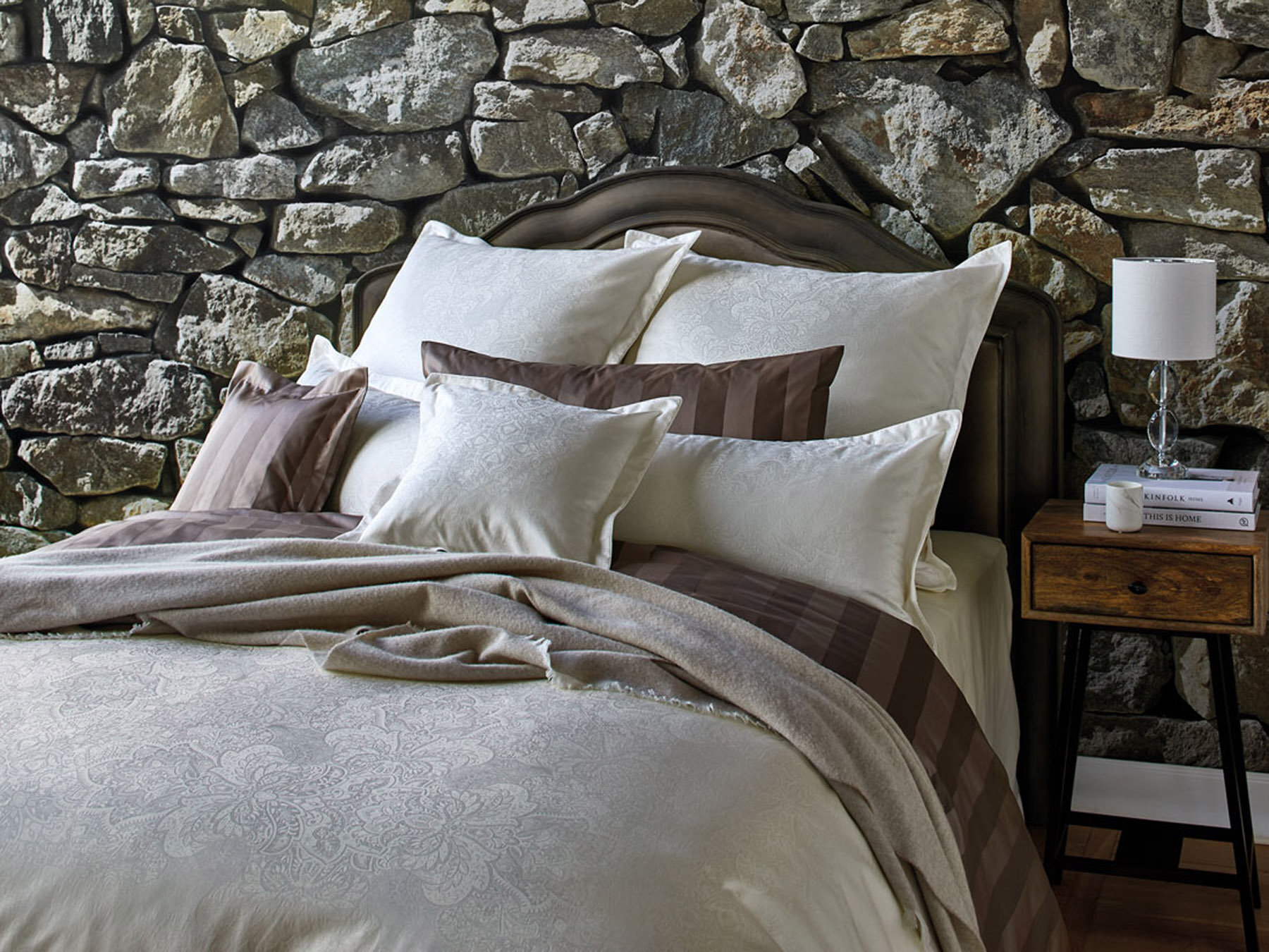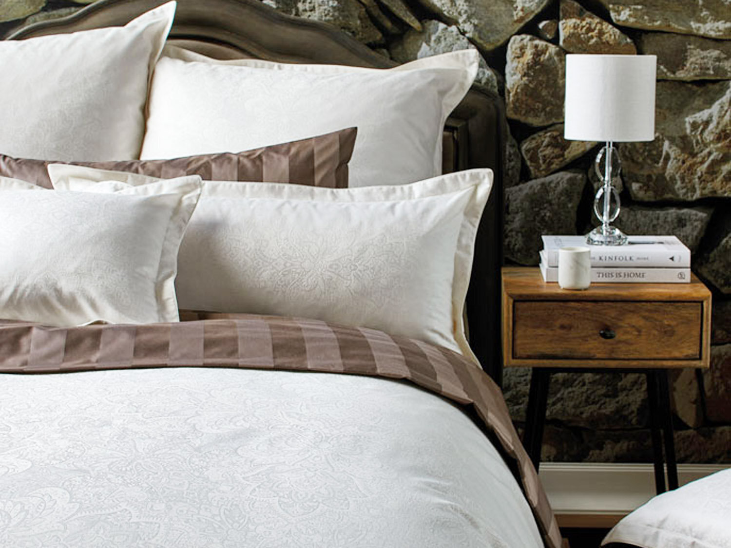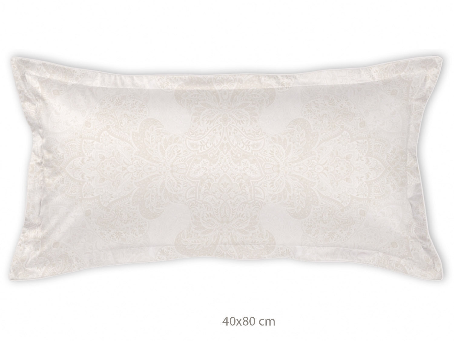 Этот высококачественный дизайн впечатляет абстрактным и тонким рисунком пейсли, который выглядит особенно элегантно в цвете не совсем белом. Наволочка сложная с 4-х сторонним подгибом (ушки) и окантовкой. Простые однотонные "спинки" подушки и пододеяльника делают внешний вид очень благородным.