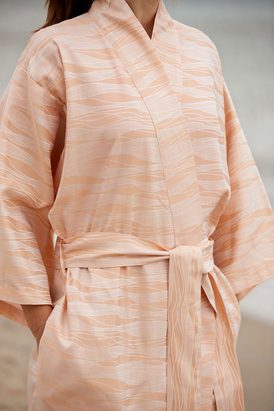 Этот дизайн кимоно демонстрирует тонкий волнообразный рисунок с плавными движениями. Цвета также кажутся довольно тихими и успокаивающими. Отличный халат - легкий и удобный.