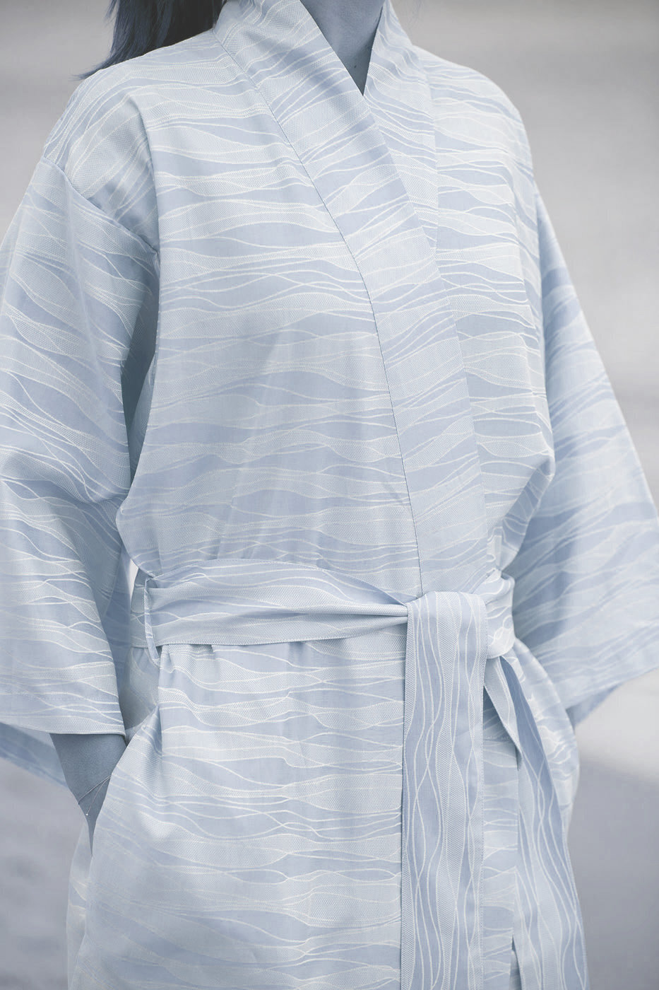Этот дизайн кимоно демонстрирует тонкий волнообразный рисунок с плавными движениями. Цвета также кажутся довольно тихими и успокаивающими. Отличный халат - легкий и удобный.