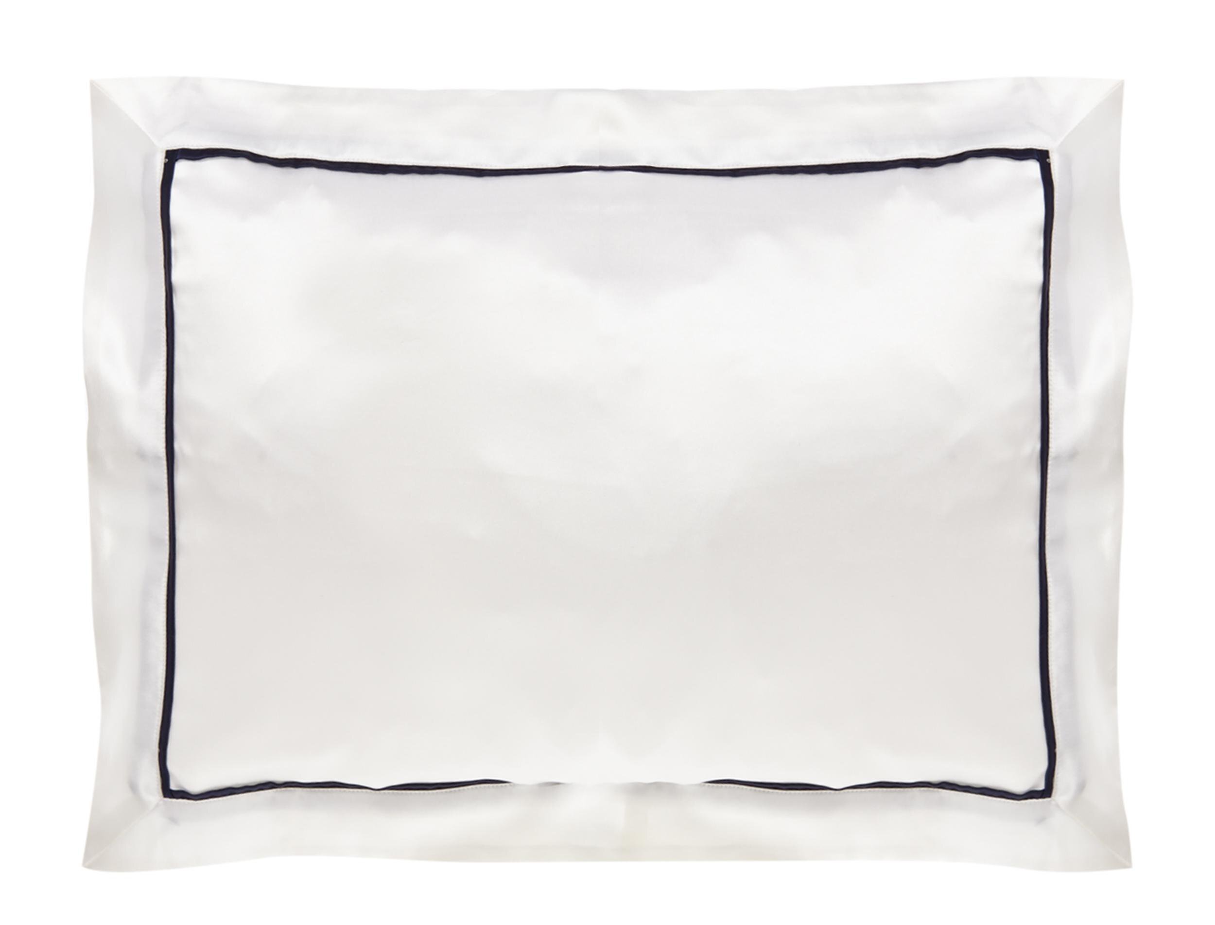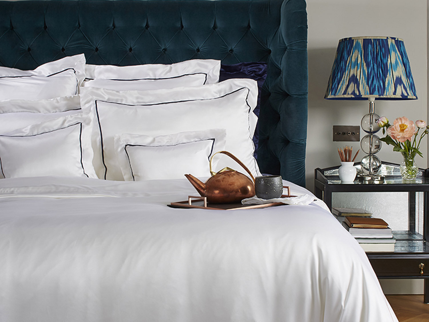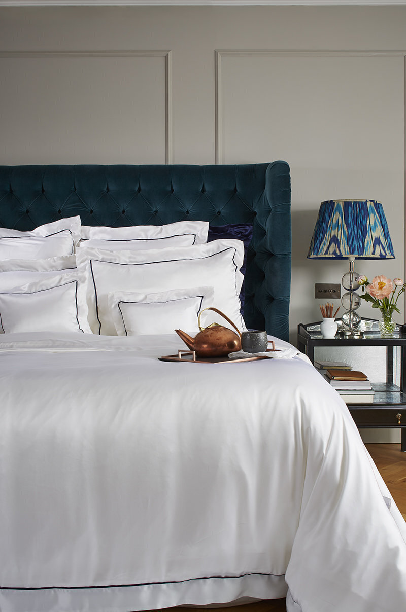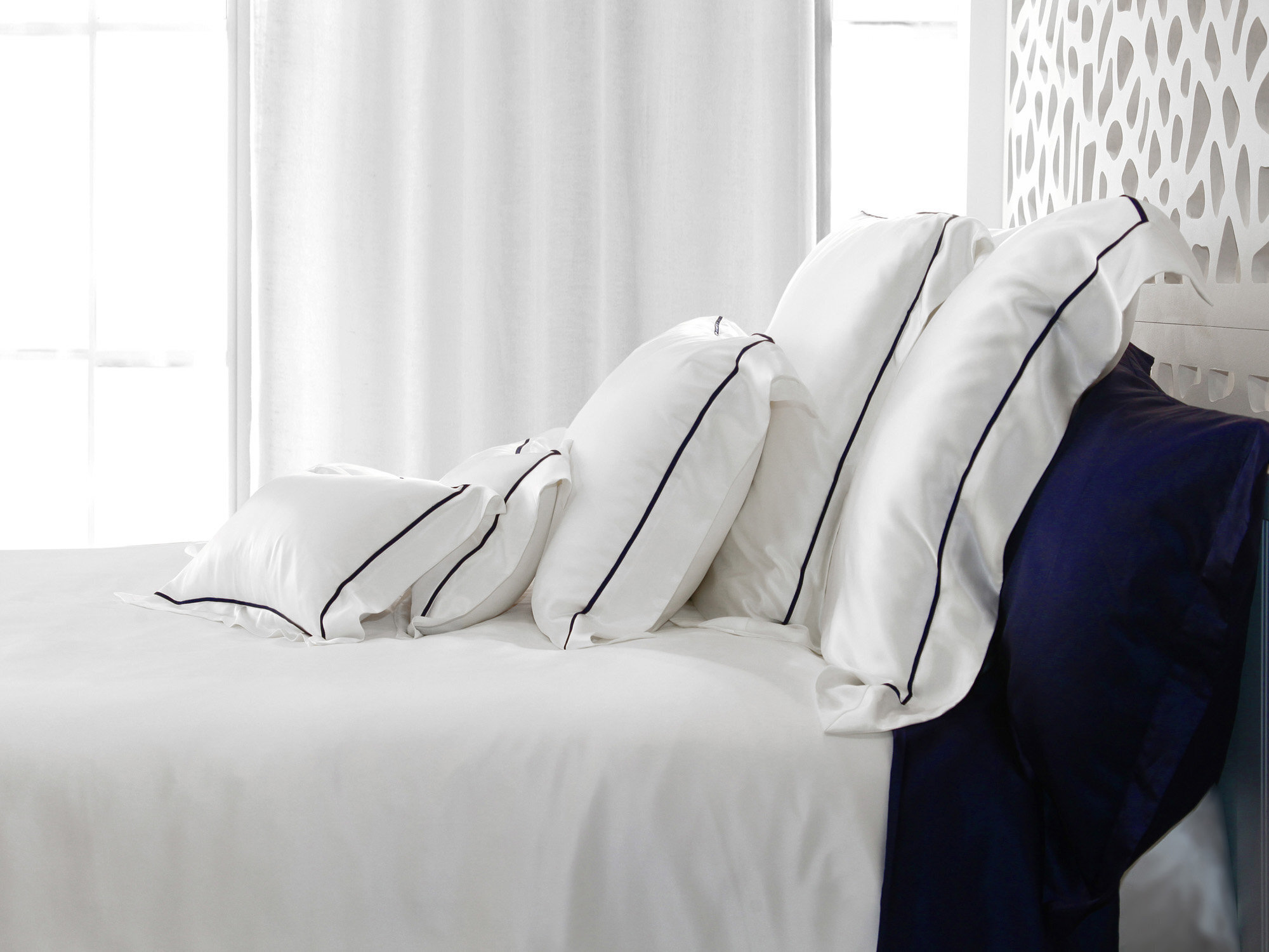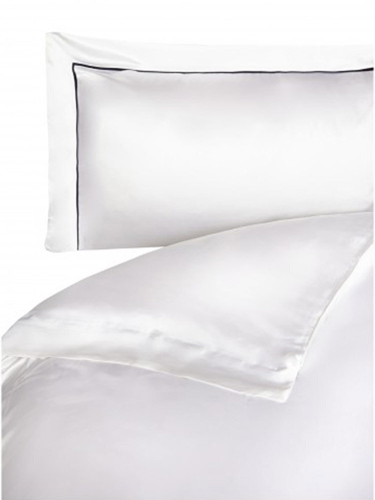 Сдержанное белье из шелка чисто белого тона, но имеет эффектное дополнение темно-синей отделкой, придающей вашей спальне элегантный морской оттенок.