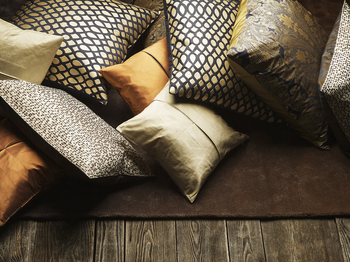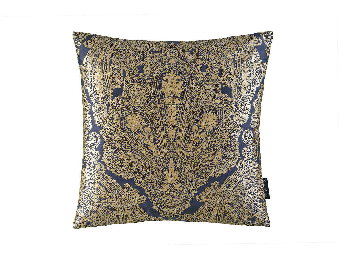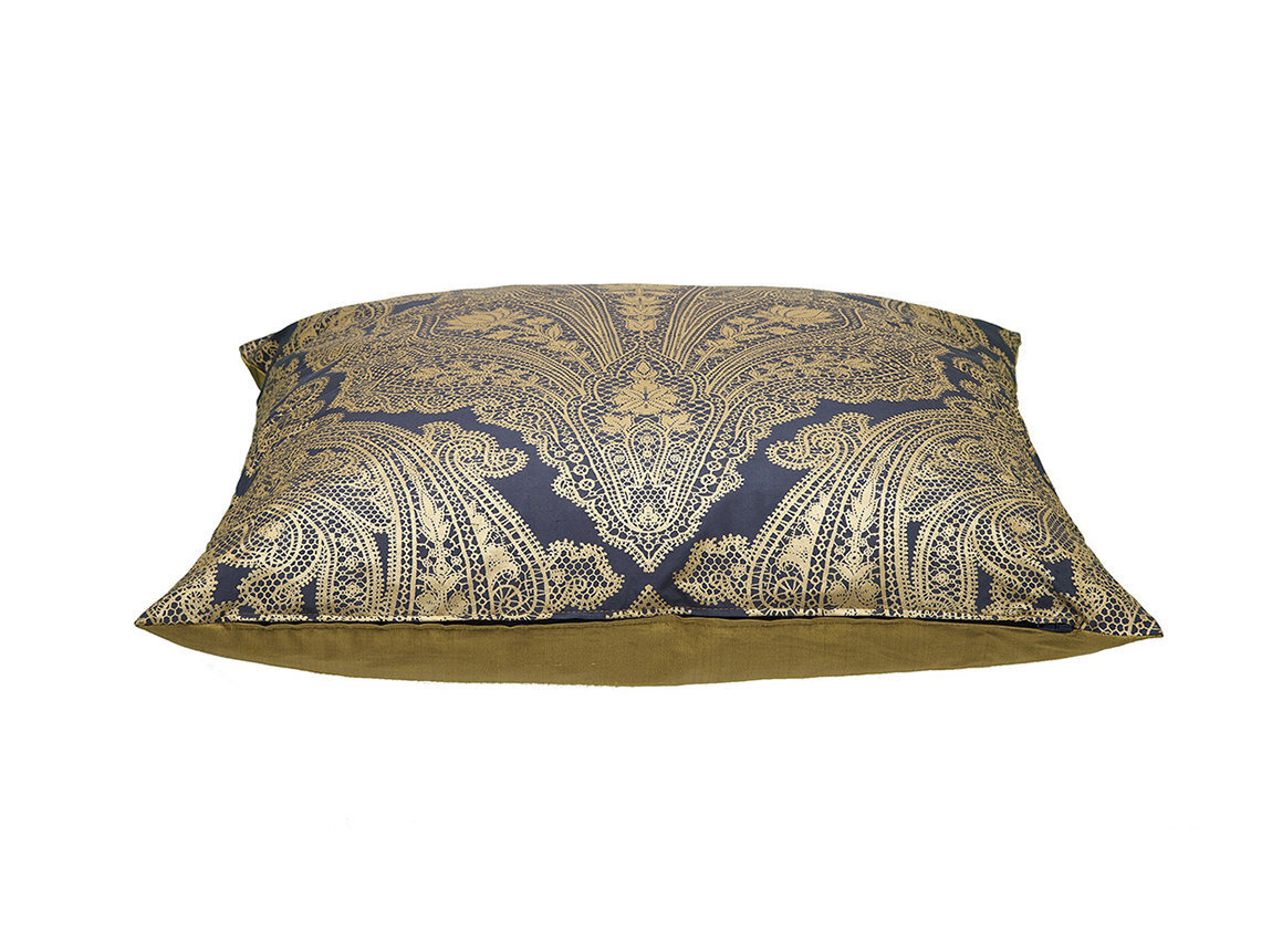 "Шах" - название полностью соответствует этому дизайну подушки. Верхняя сторона наволочки с очень красивым и нежным золотой Пейсли узором на темно синем фоне. Обратная сторона из однотонного шелка золотого тона.