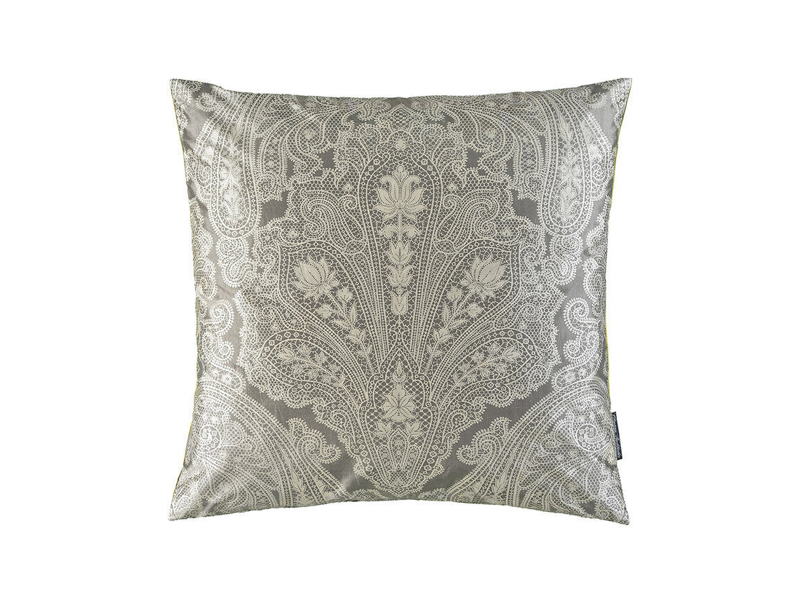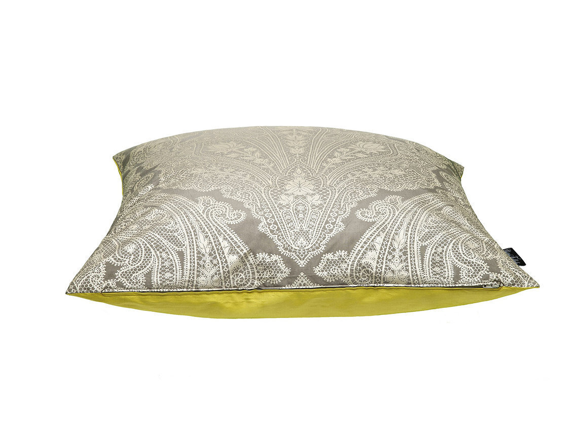 "Шах" - название полностью соответствует этому дизайну подушки. Верхняя сторона наволочки с очень красивым и нежным белым Пейсли узором на сером фоне. Обратная сторона из однотонного шелка желтого тона.