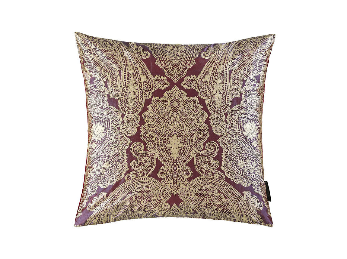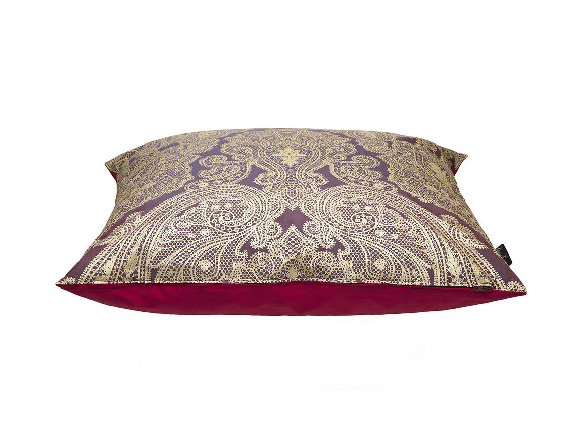 "Шах" - название полностью соответствует этому дизайну подушки. Верхняя сторона наволочки с очень красивым и нежным золотой Пейсли узором на бордовом фоне. Обратная сторона из однотонного шелка красного тона.