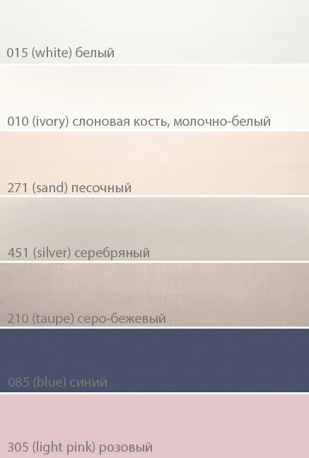 Цвет: 010 (ivory) слоновая кость, 015 (white) белый, 060 (celeste) голубой, 085 (blue) синий, 095 (petrol) нефтяной, 210 (taupe) серо-бежевый, 271 (sand) песочный, 305 (light pink) розовый, 451 (silver) серебряный, 480 (platin) платина