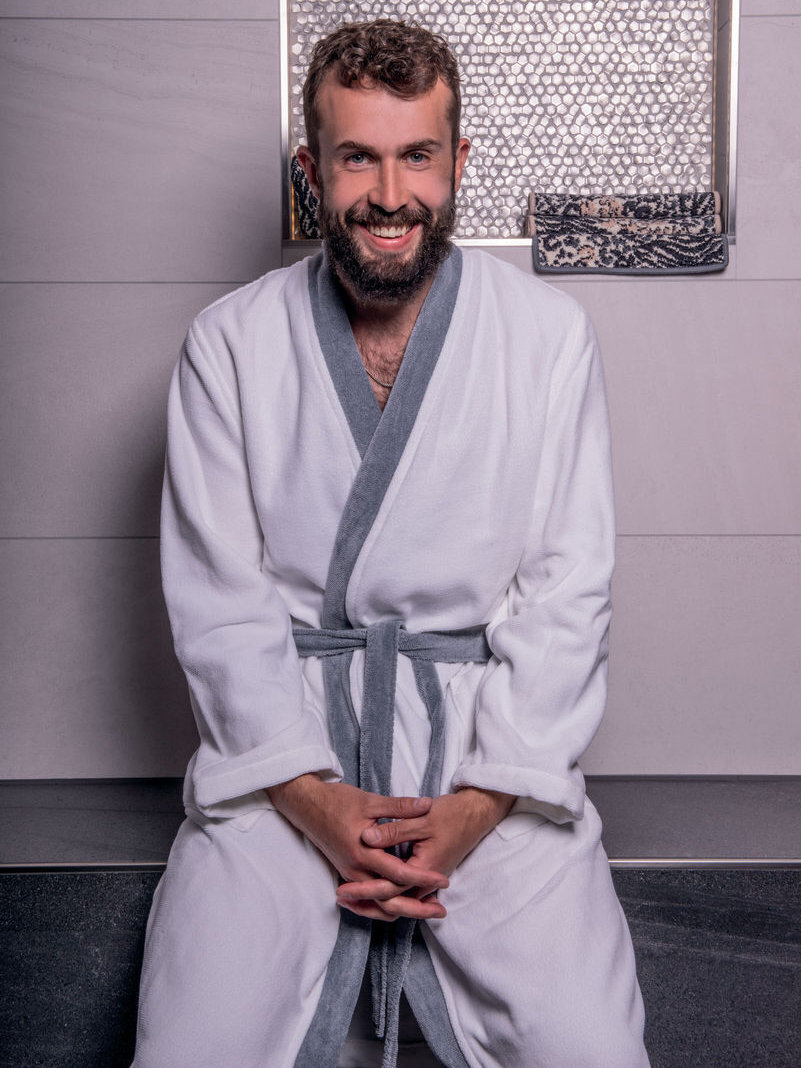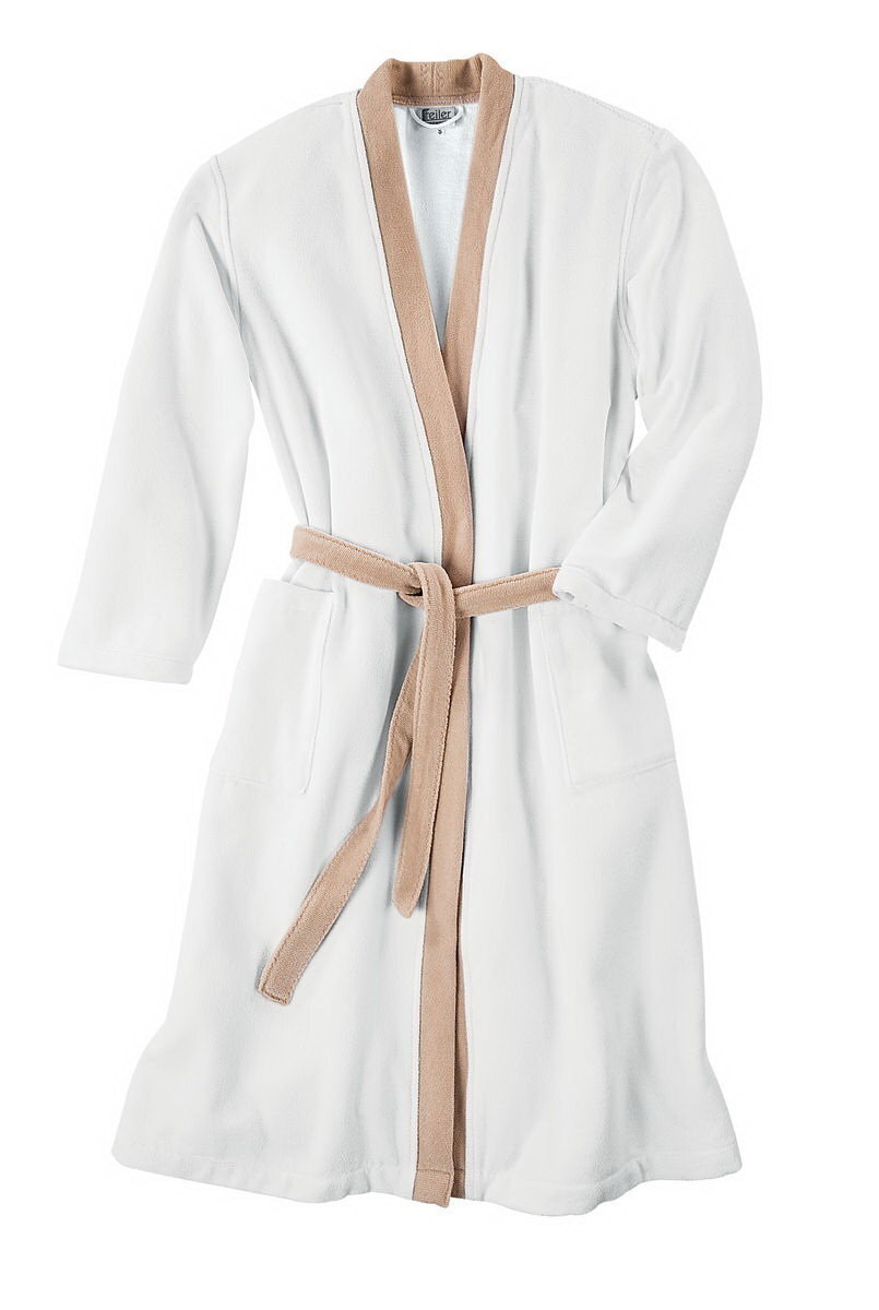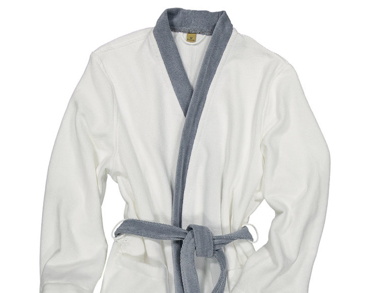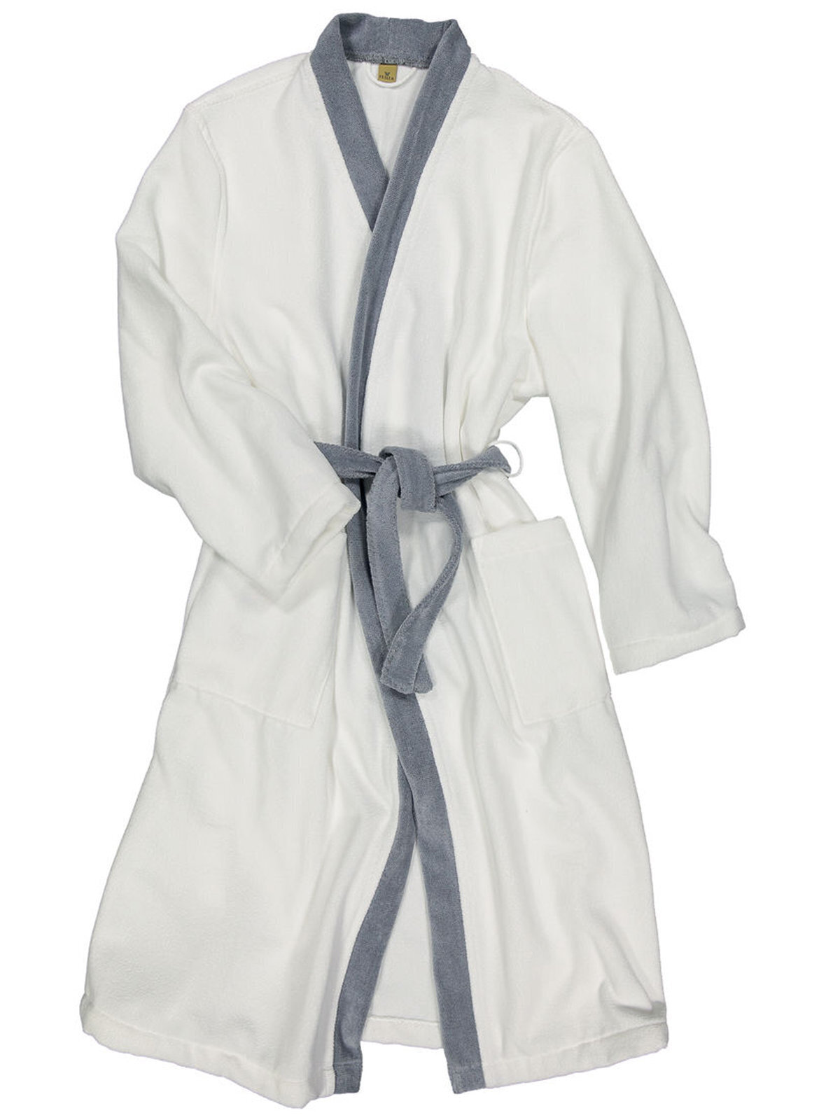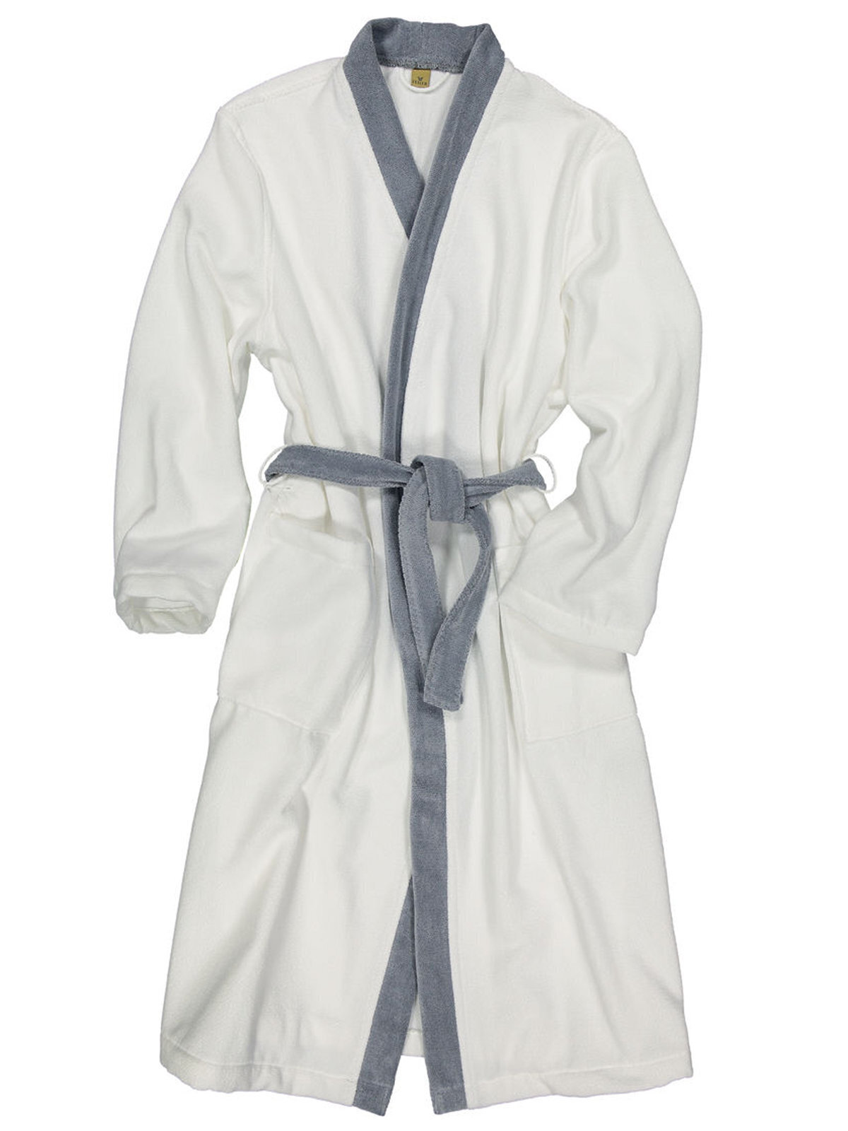 Однотонный халат Unisex из шенилла с контрастной окантовкой. Имеет пояс, 2 накладных кармана