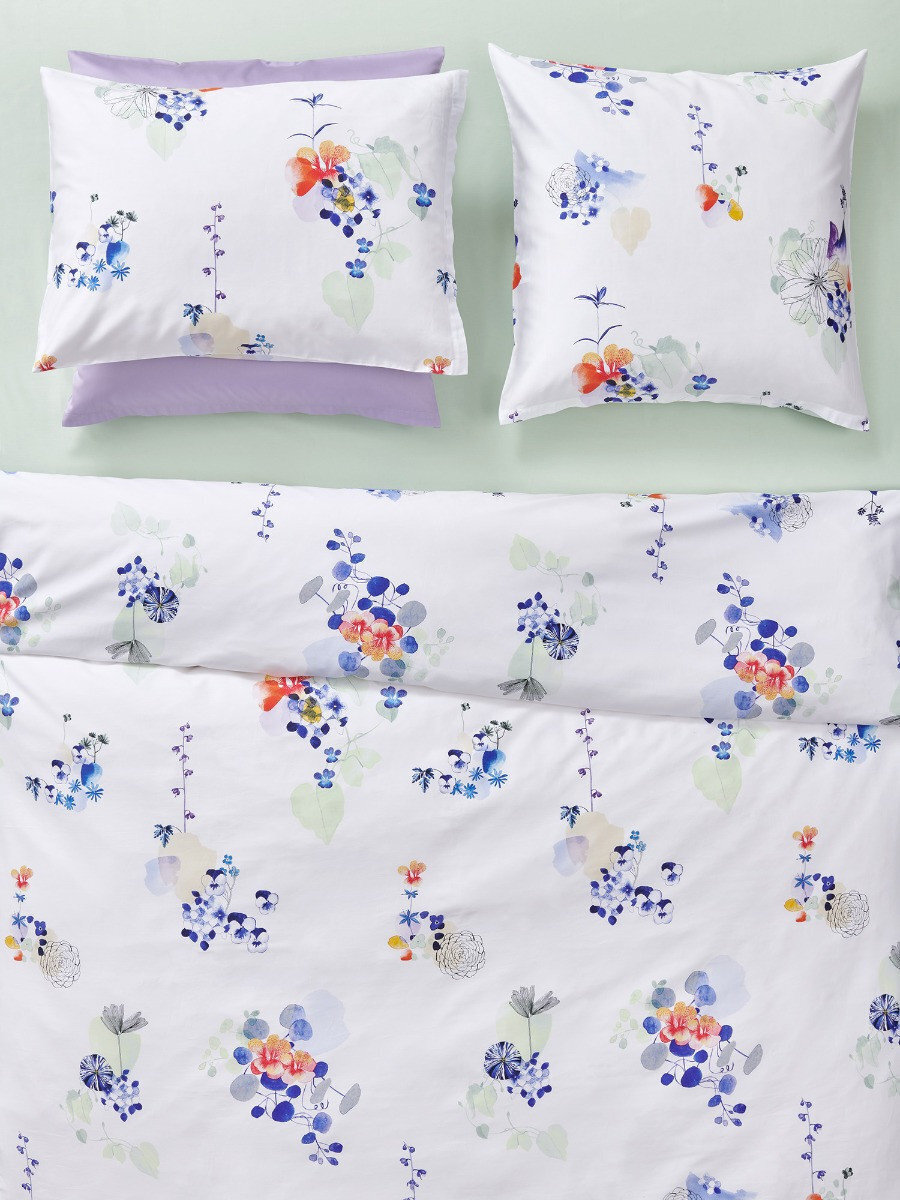 VIOLA с тонкими, похожими на акварель переходами и прозрачными наложениями представляет собой летний цветочный узор, который создается с использованием сложного процесса печати. Было необходимо 14 печатных экранов, чтобы сделать рисунок во всей красе. Ручная роспись садовых цветов включает настурции, фиалки, незабудки и гортензии.